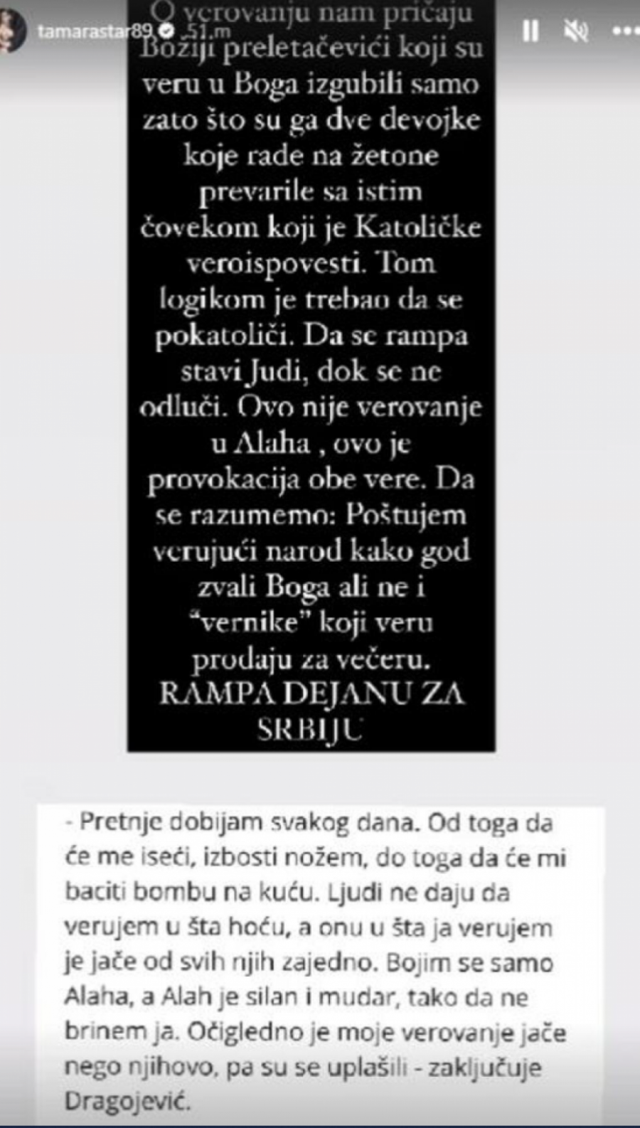 - O verovanju nam pričaju "Božiji preletačevići" koji su veru u Boga izgubili samo zato što su ga dve devojke koje rade na žetone prevarile sa istim čovekom koji je katoličke veroispovesti. Tom logikom je trebao da se pokatoliči. Da se rampa stavi Judi, dok se ne odluči. Ovo nije verovanje u Alaha, ovo je provokacija obe vere. Da se razumemo - Poštujem verujući narod kako god zvali Boga, ali ne i ,,vernike" koji veru prodaju za večeru. Rampa Dejanu za Srbiju - poručila je Tamara na Instagram storiju.