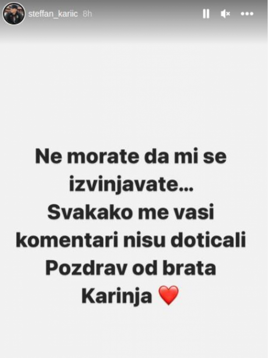 - Ne morate da mi se izvinjavate. Svakako me vaši komentari nisu doticali. Pozdrav od brata Karinja - napisao je Stefan na svom Instagram profilu.