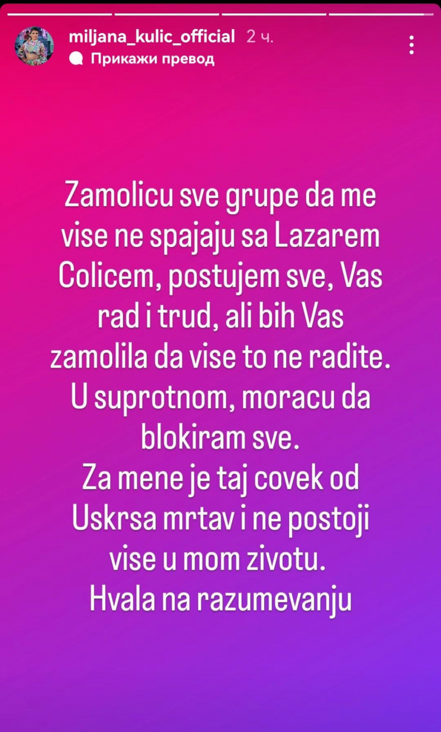 "Zamoliću sve grupe da me više ne spajaju sa Lazarem Čolićem. Poštujem vas sve, vaš trud i rad, ali bih vas zamolila da to više ne radite. U suprotvnom, moraću da blokiram sve. Za mene je taj čovek od Uskrsa mrtav i ne postoji više u mom životu. Hvala na razumevanju", napisala je ona na svom Instagram profilu.