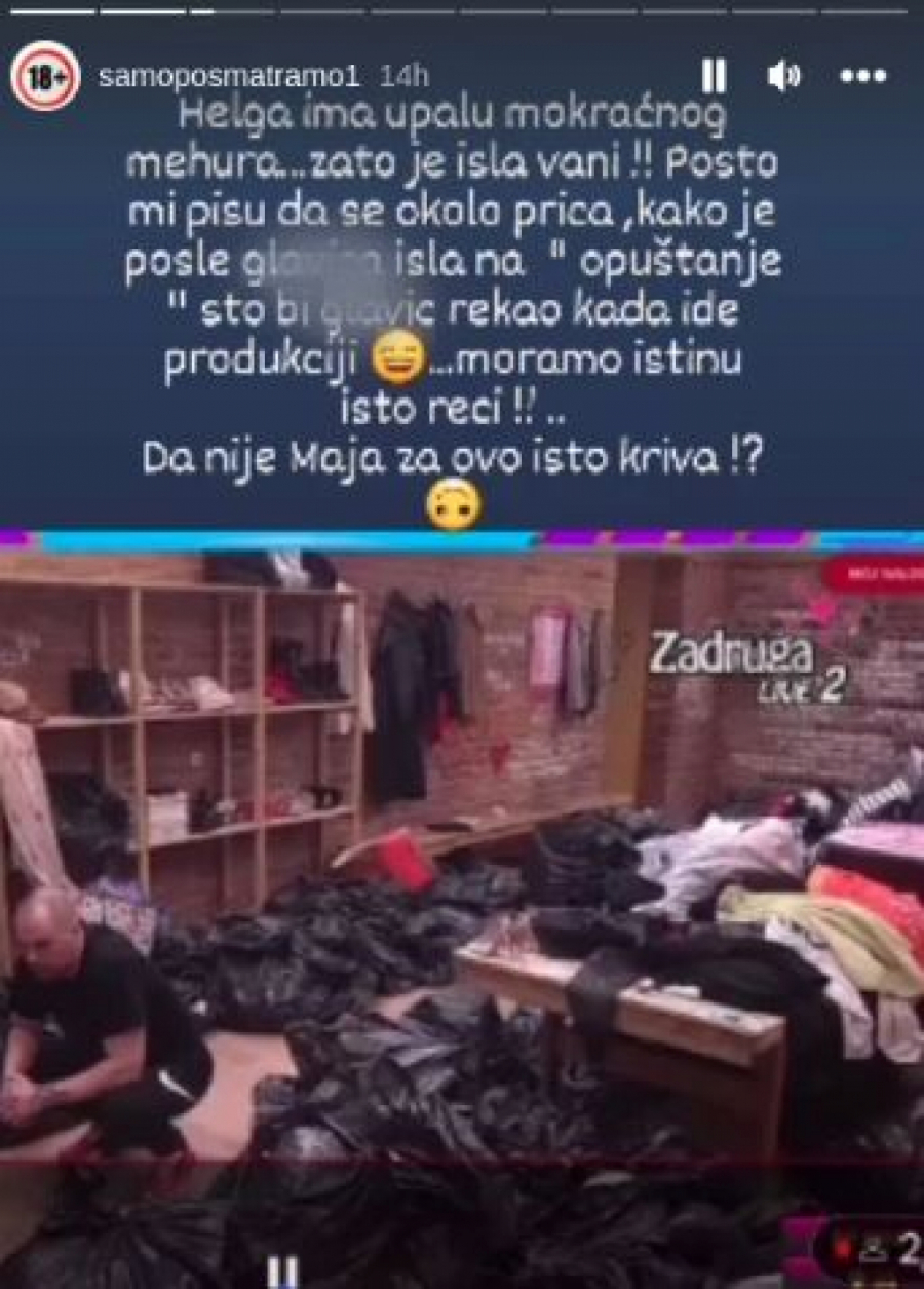 -Helga ima upalu bešike, zato je izlazila pre neki dan. Pošto se piše da okolo govore kako je išla na "opuštanje" što je izraz koji Zvezdan govori kada ide do produkcije. Moramo reći istinu, da nije Maja za ovo kriva? - glasio je opis koji je išao uz video na kom je govorila Đuričićeva, a gde je rekla sledeće: