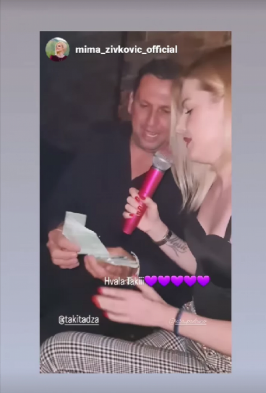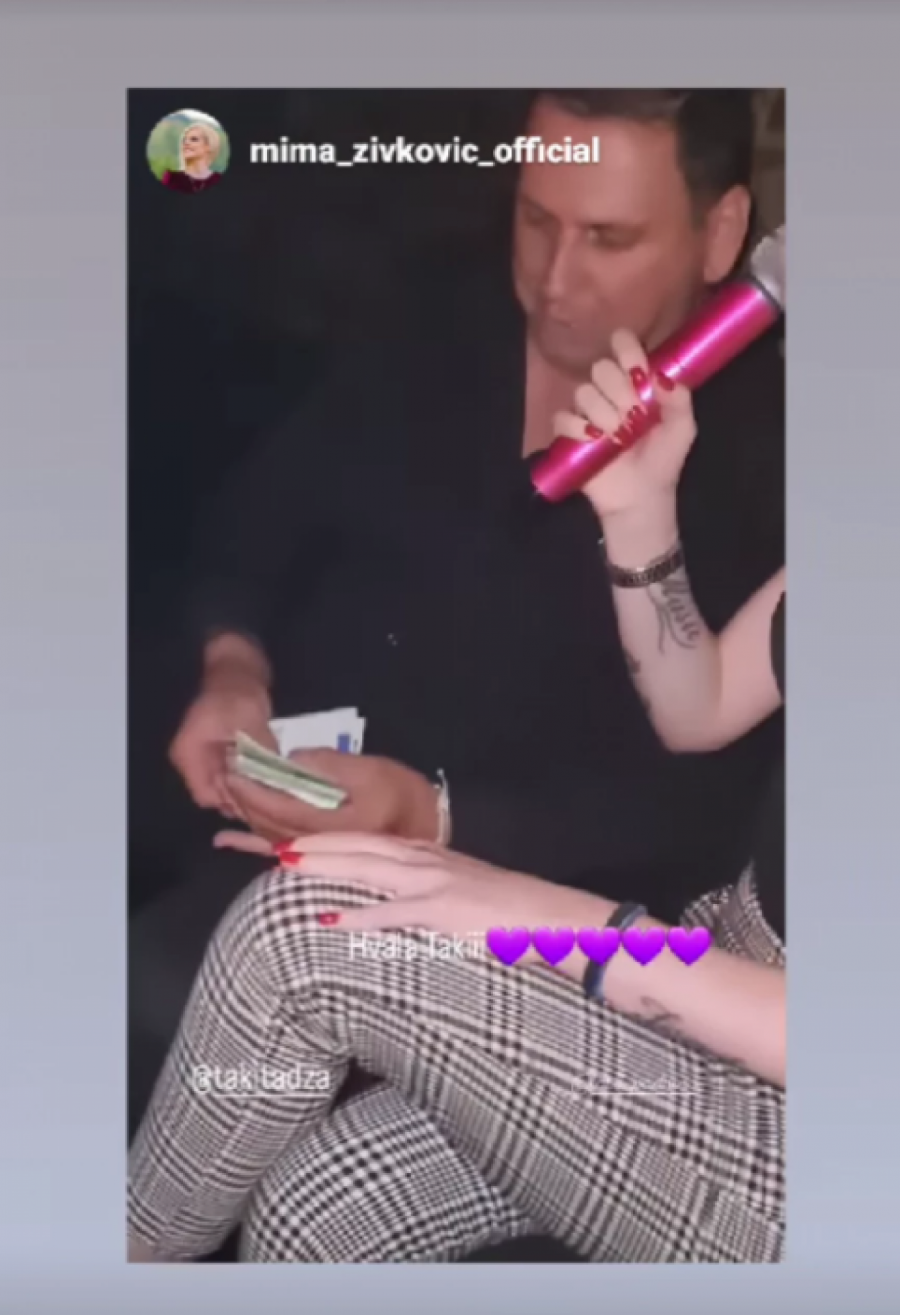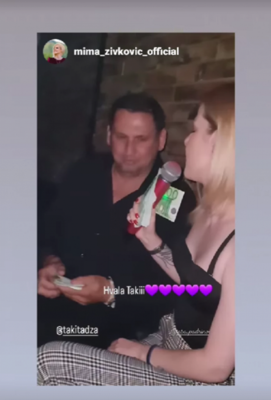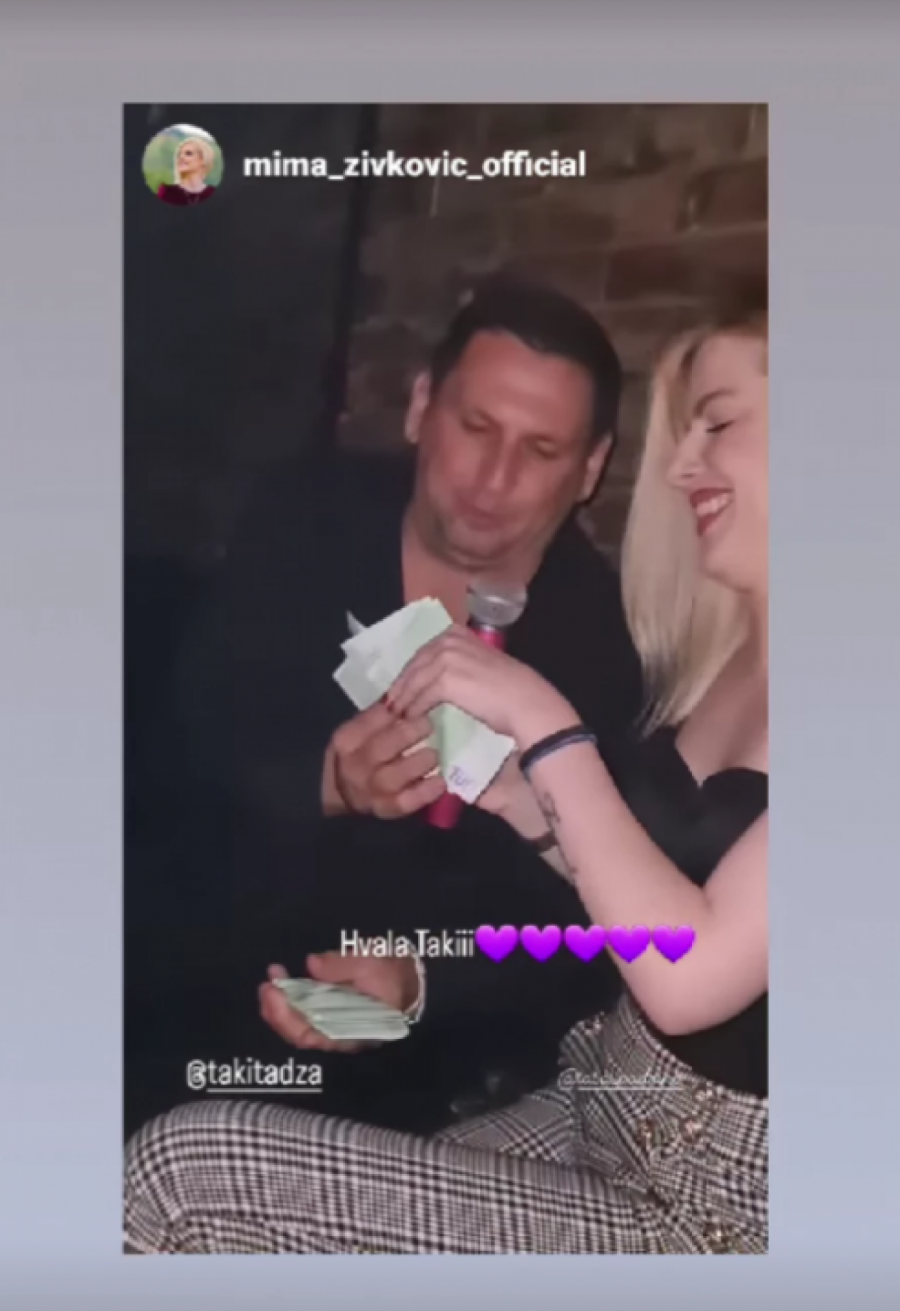 Sudeći po snimku koji je osvanuo na društvenoj mreži Instagram, Taki je Živkovićevoj za samo jedan stih dao čak 800 evra, a zelene i narandžaste novčanice nastavile su da se nižu oko pevačicinog mikrofona.
