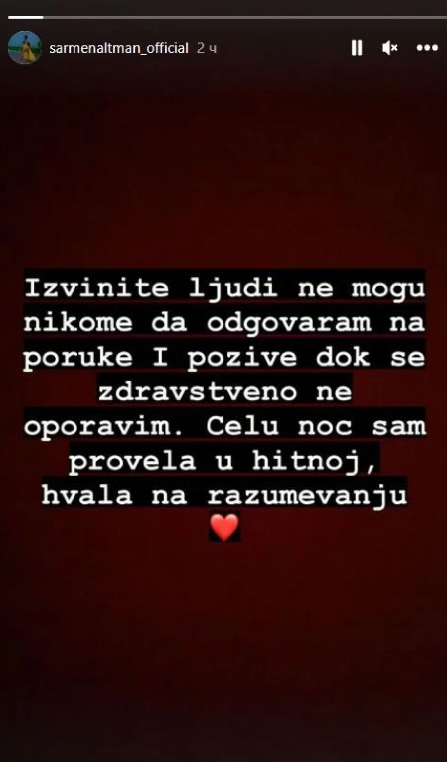 Šarmen se ovom prilikom oglasila za medije i otkrila kako se oseća i zbog čega je završila u hitnoj, a onda je istakla kako joj je pozlilo, ali da još uvek čeka rezultate kako bi saznala o čemu je tačno reč.