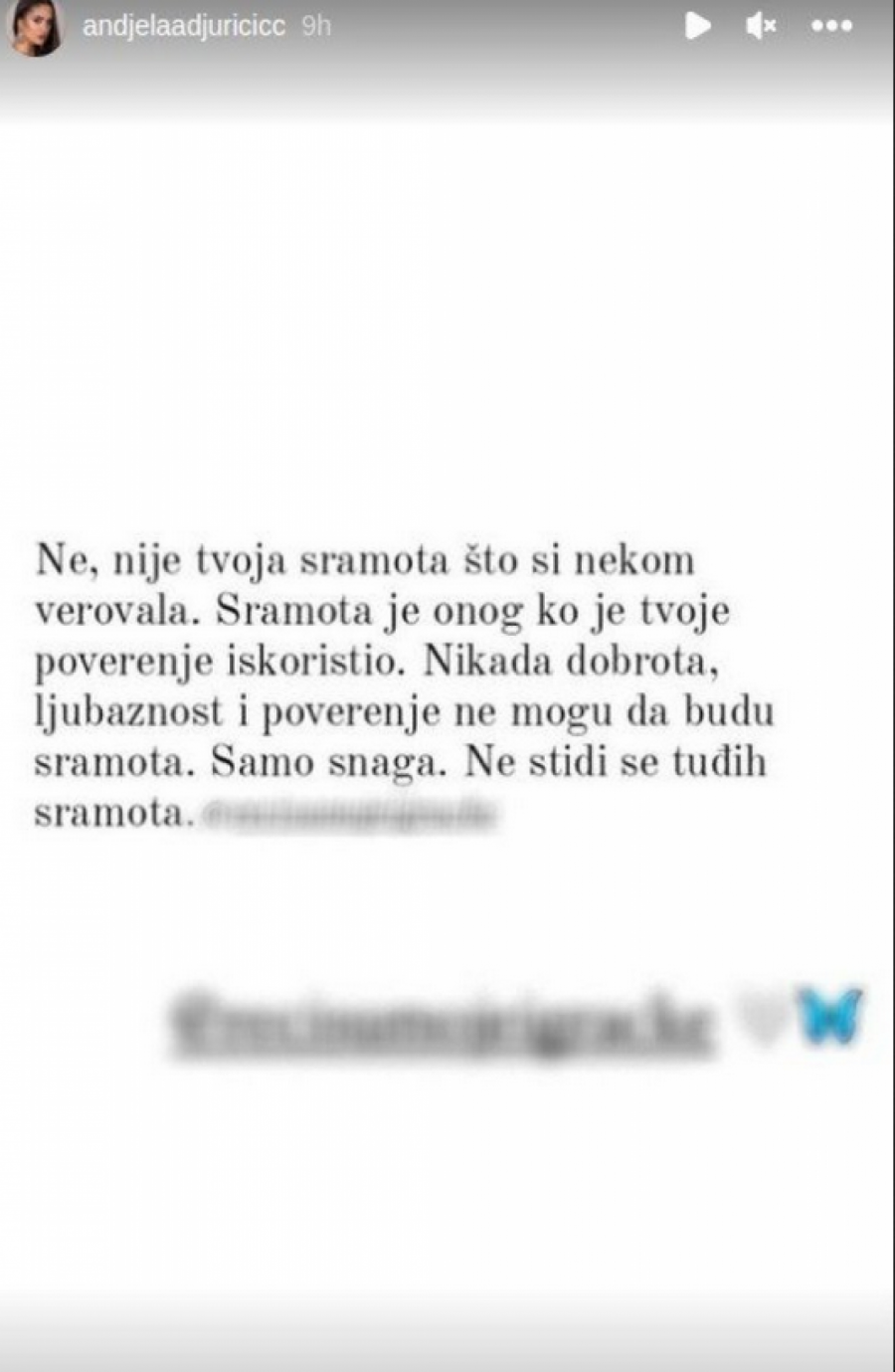 -Ne, nije tvoja sramota što si nekom verovala. Sramota je onoga ko je tvoje poverenje iskoristio. Nikada dobrota, ljubaznost i poverenje ne mogu da budu sramota. Samo snaga. Ne stidi se tuđih sramota - glasio je citat koji je Đuričićeva podelila na svom Instagram profilu.