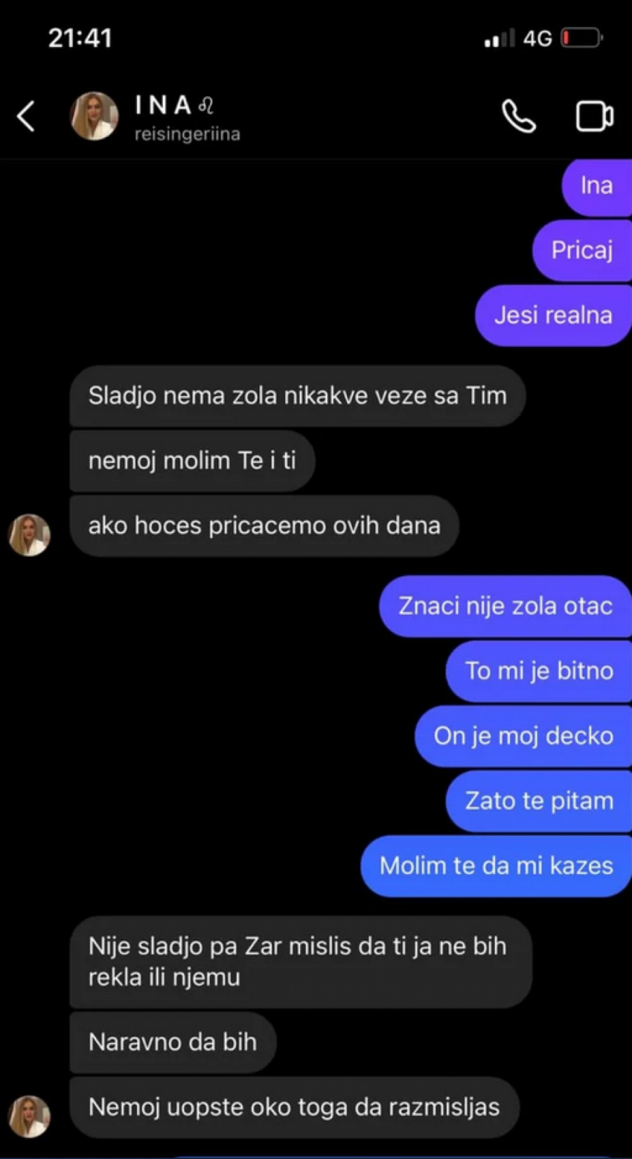 -Hvala vam na savetima iskreno, ali malo mi je glupo da idem u policiju. Nije izvršila otmicu i ovim putem je molim da mi se otvori maksimalno, da mi ispriča sve, nema potrebe da se brine ako sam ja otac - rekao je Čolić, te je potom pročitao prepisku sa Inom.
