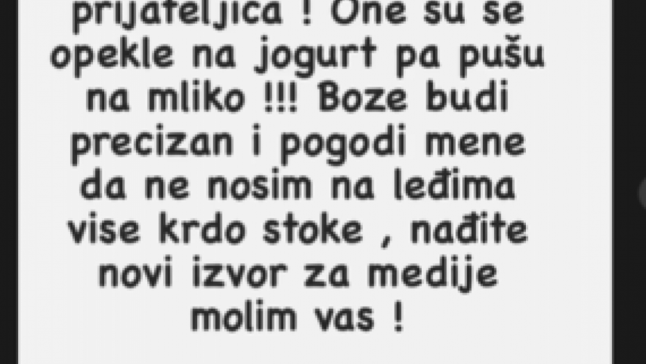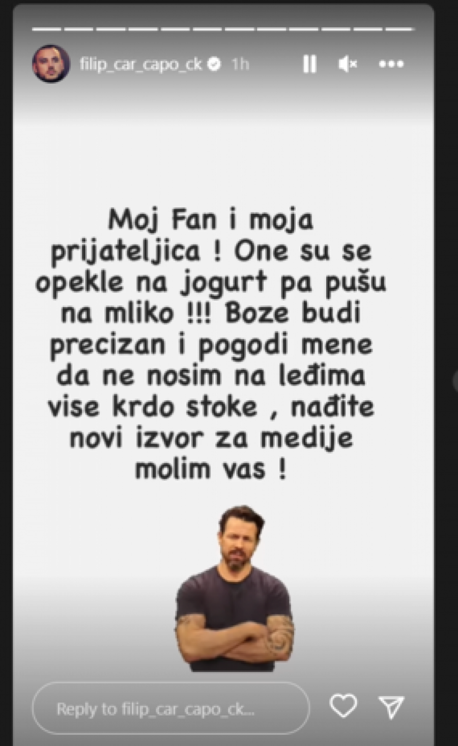 - Moj fan i moja prijateljica. One su se opekle na jogurt pa pušu na mliko!!! Bože budi precizan i pogodi mene da ne nosim na leđima više krdo stoke, nađite novi izvor za medije, molim vas - objavio je Car na Instagramu, pa nesumnjivo aludira na Moskvu, a samim tim i Anđelu kojoj se u svakoj nevolji, istina, našao kao pravi drug.