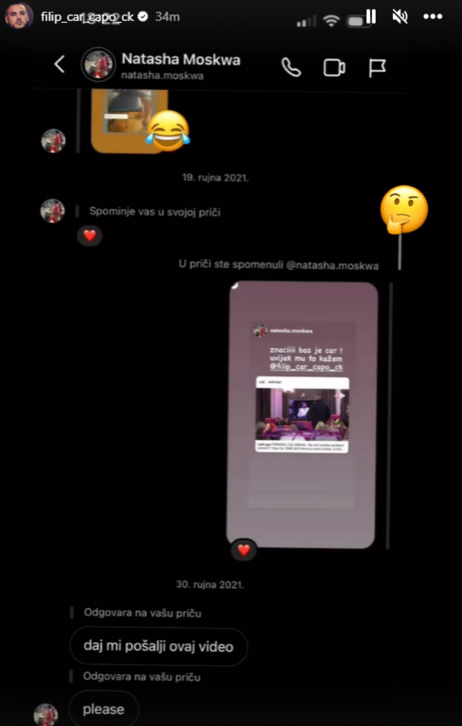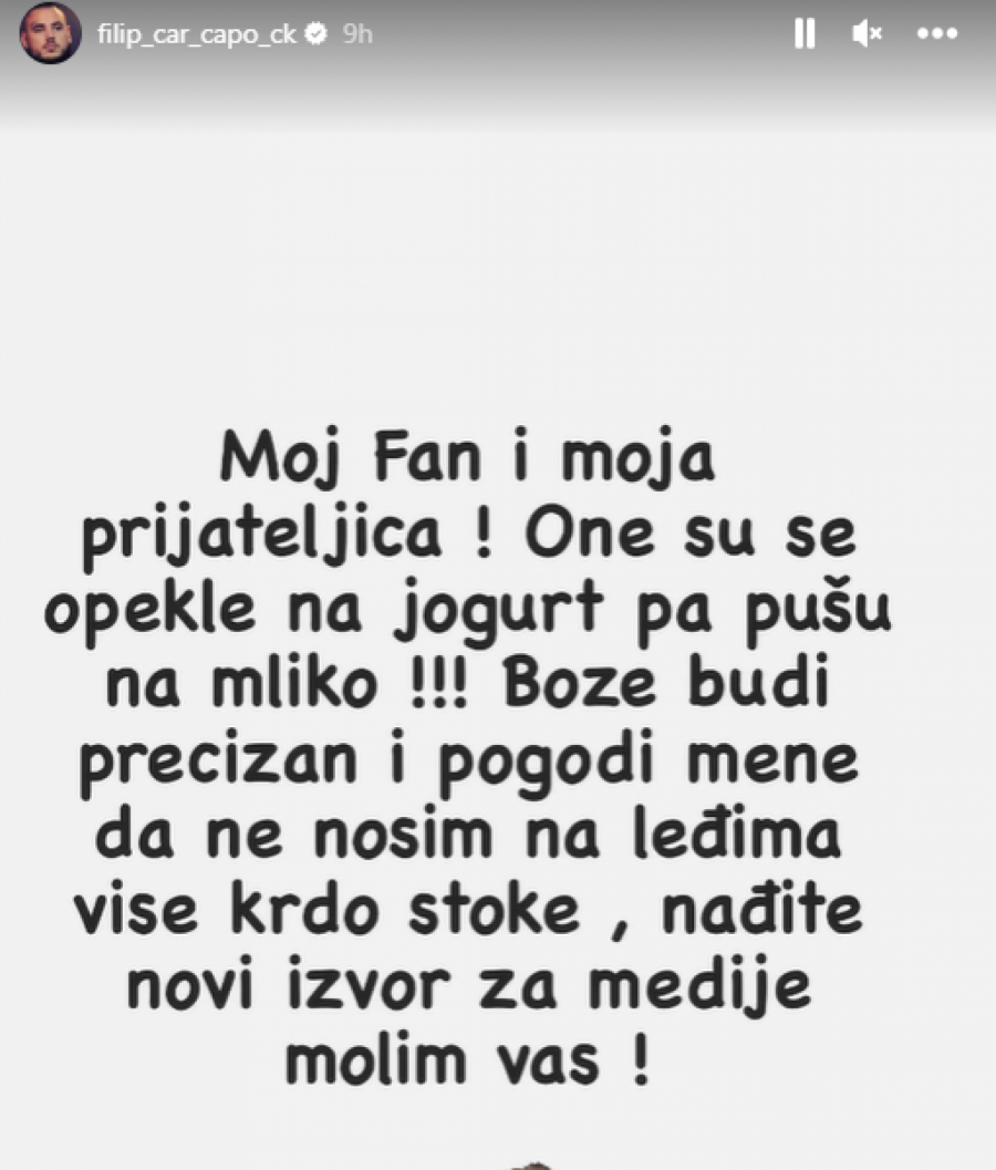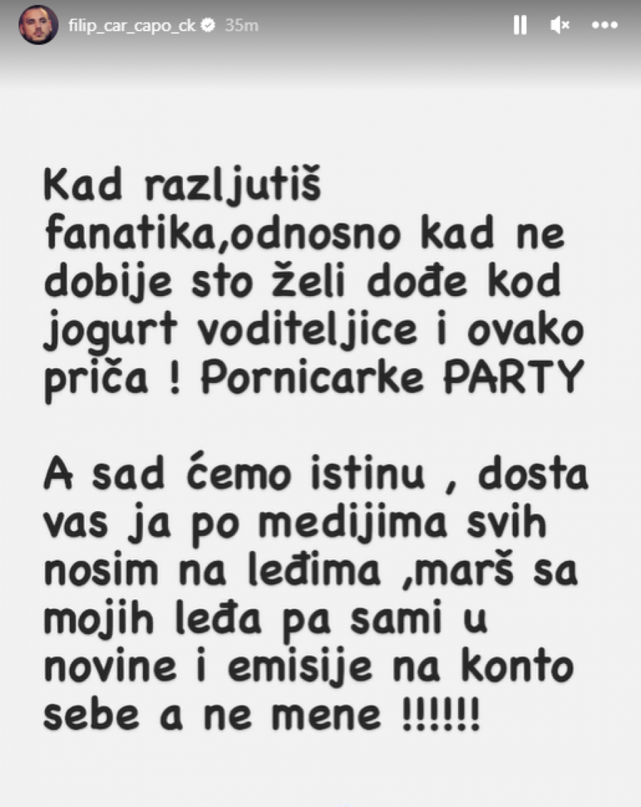 - Kad razljutiš fanatika, odnosno kad ne dobije šta želi dođe kod jogurt voditeljke i ovako priča. A sad ćemo istinu, dosta vas ja po medijima sve nosim na leđima, marš sa mojih leđa pa sami u novine i emisija akonto sebe, a ne mene. - napisao je vidno besan i izrevoltiran Filip, uz skrinšotove pomenute prepiske sa Natašom Moskvom.