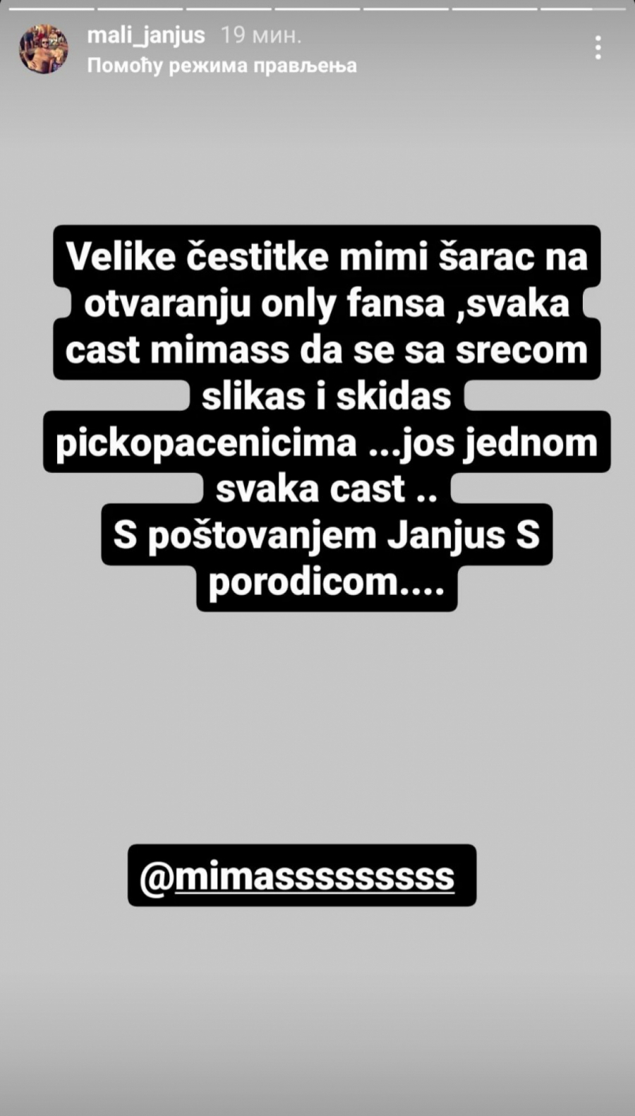 - Velike čestitke Mimi Šarac na otvaranju OnlyFansa, svaka čast Mimas, da se sa srećom skidaš i slikaš pi*kopaćenicima, još jednom svaka čast! S poštovanjem, Janjuš sa porodicom - napisao je u prvoj objavi Janjuš, a potom dodao: