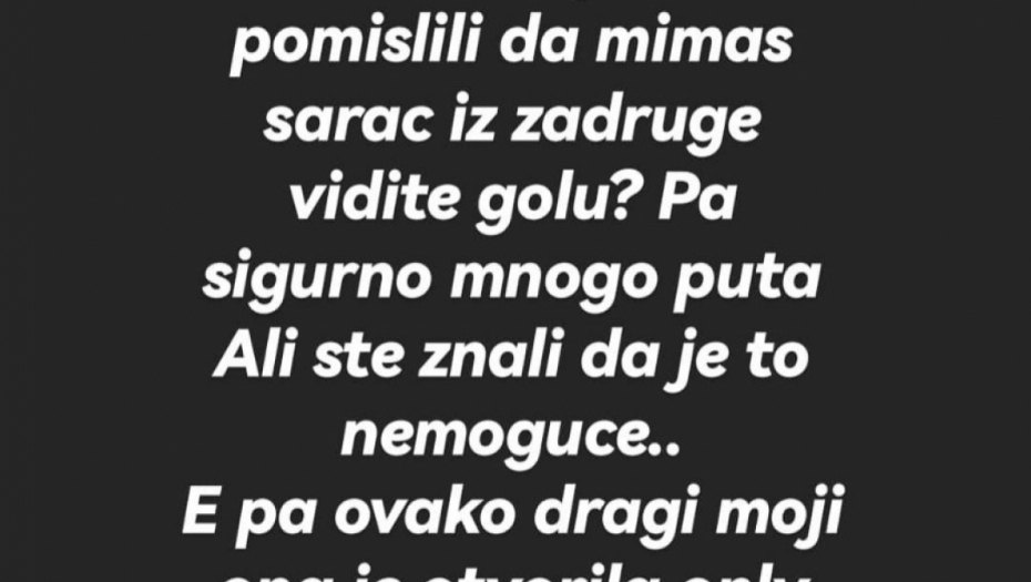 - I kad pomislite da vam se neke želje nikad neće ostvariti, e pa baš nije tako! Grešite... Koliko ste samo puta pomislili da Mimas Šarac iz Zadruge vidite golu?! Pa sigurno mnogo puta, ali ste znali da je to nemoguće! E pa dragi moji, ona je otvorila OnlyFans i moži ćete da d*kate za samo pet dolara, odmah se pretplatite, Mimas vas čeka - zaključio je Janjuš u svom stilu i dao Mimi svojevrsnu reklamu za prve korake u novom poslu.