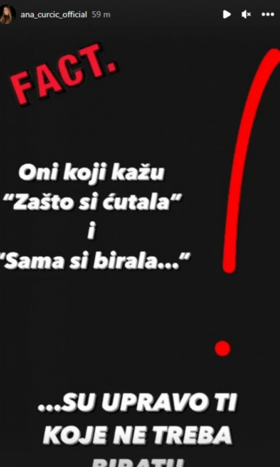 - Činjenica! Oni koji kažu ,,Zašto si ćutala" i ,,Sama si birala", su upravo ti koje ne treba birate - napisala je Ana na Instagram profilu.