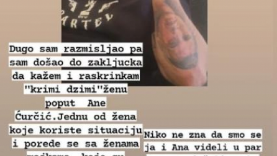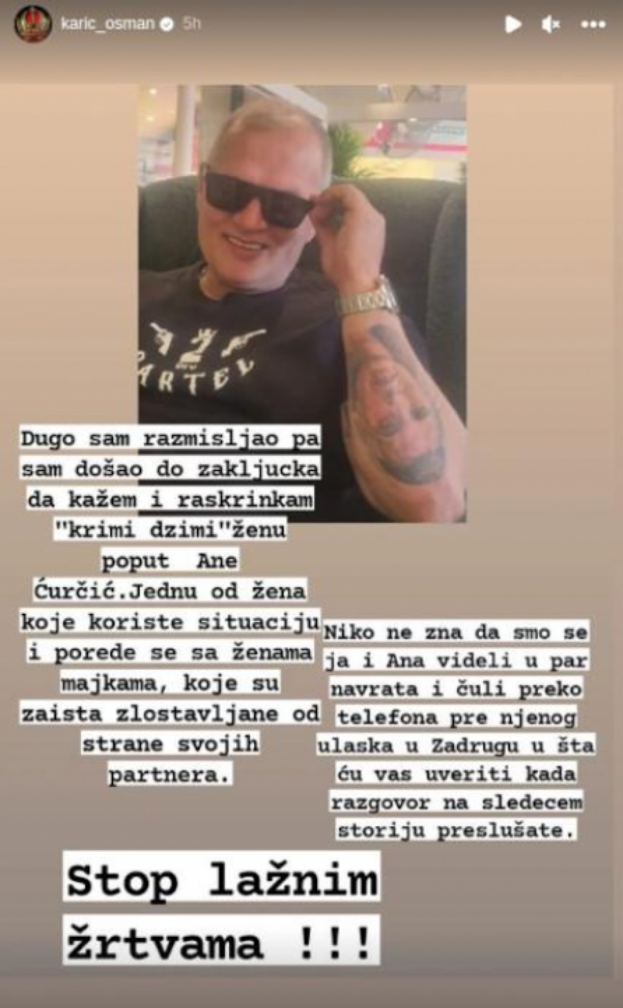 - Dugo sam razmišljao pa sam došao do zaključka da kažem i raskrinkam "krimi džimi" ženu poput Ane Ćurčić. Jednu od žena koje koriste situaciju i porede se sa ženama, majkama, koje su zaista zlostavljane od strane svojih partnera. Niko ne zna da smo se ja i Ana videli u par navrata i čuli preko telefona pre njenog ulaska u Zadrugu u šta ću vas uveriti kada razgovor na sledećem storiju preslušate. Stop lažnim žrtvama - napisao je Osman.