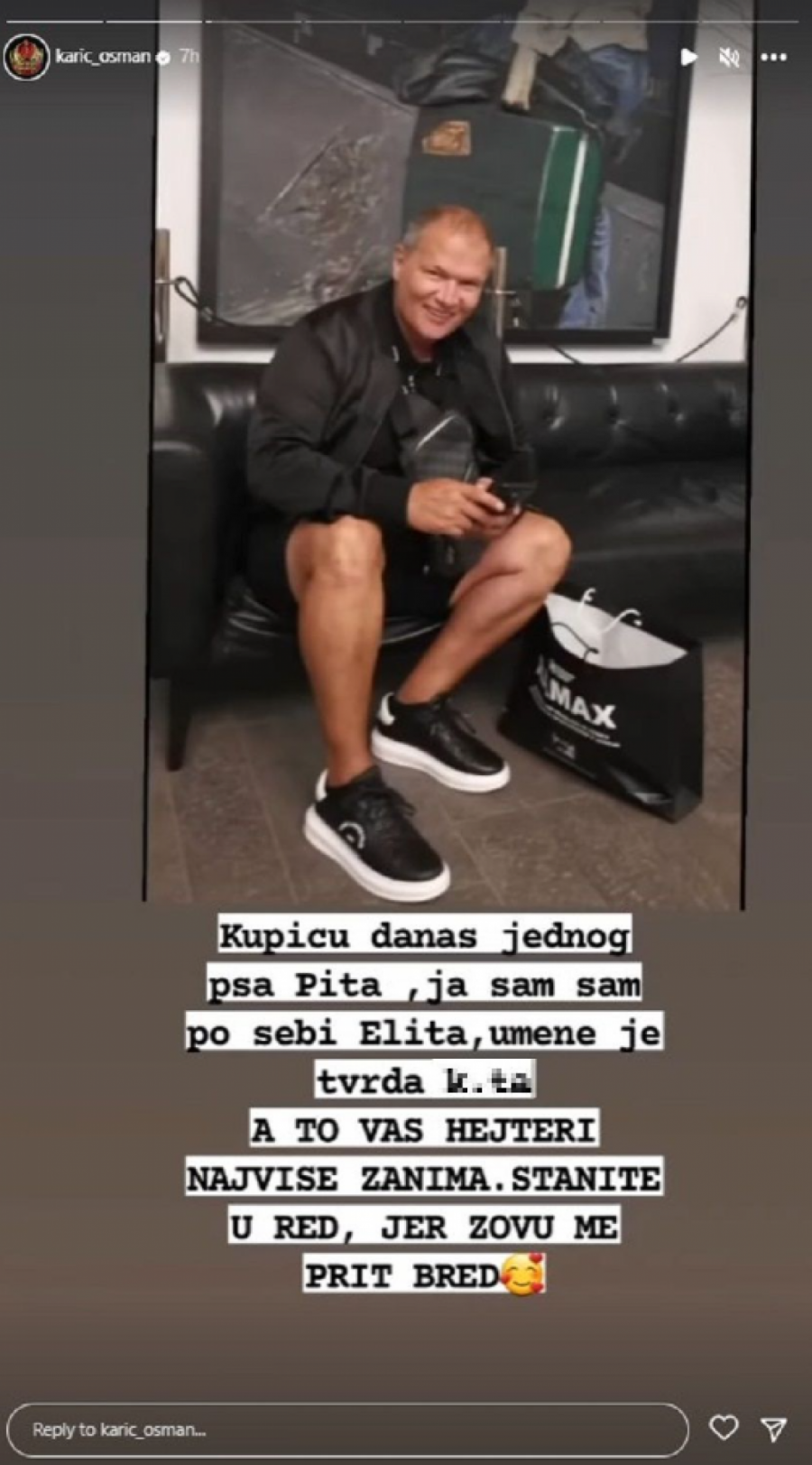 - Kupiću danas jednog psa Pita, ja sam sam po sebi "Elita", u mene je tvrda k***. A to vas hejteri najviše zanima, stanite u red, jer zovu me Pit Bred - započeo je Osman, pa nastavio: