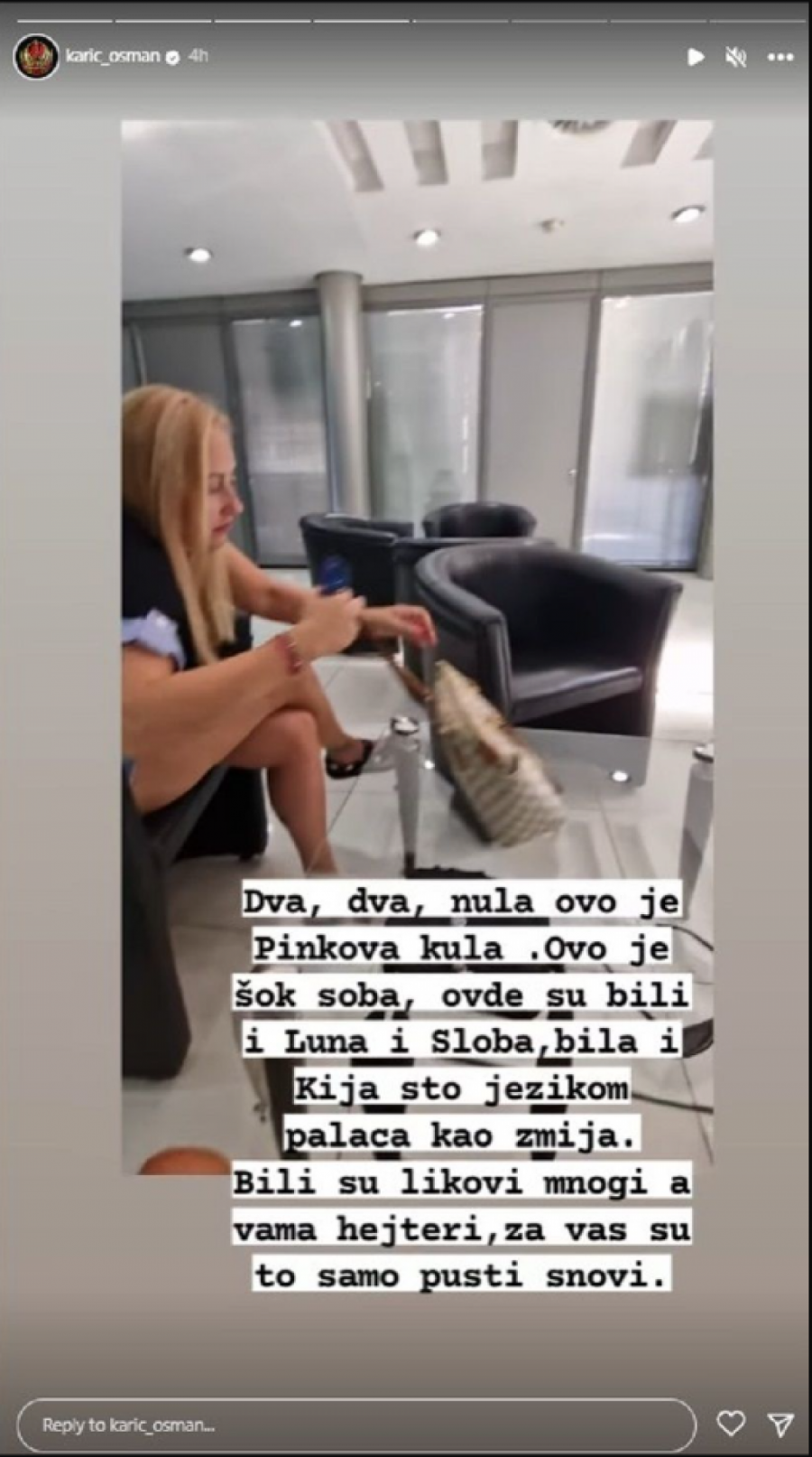 - Dva, dva, nula, ovo je Pinkova kula. Ovo je šok soba, ovde su bili i Luna i Sloba, bila i Kija, što jezikom palaca kao zmija. Bili su likovi mnogi, a vama hejteri, za vas su to samo pusti snovi - napisao je on.