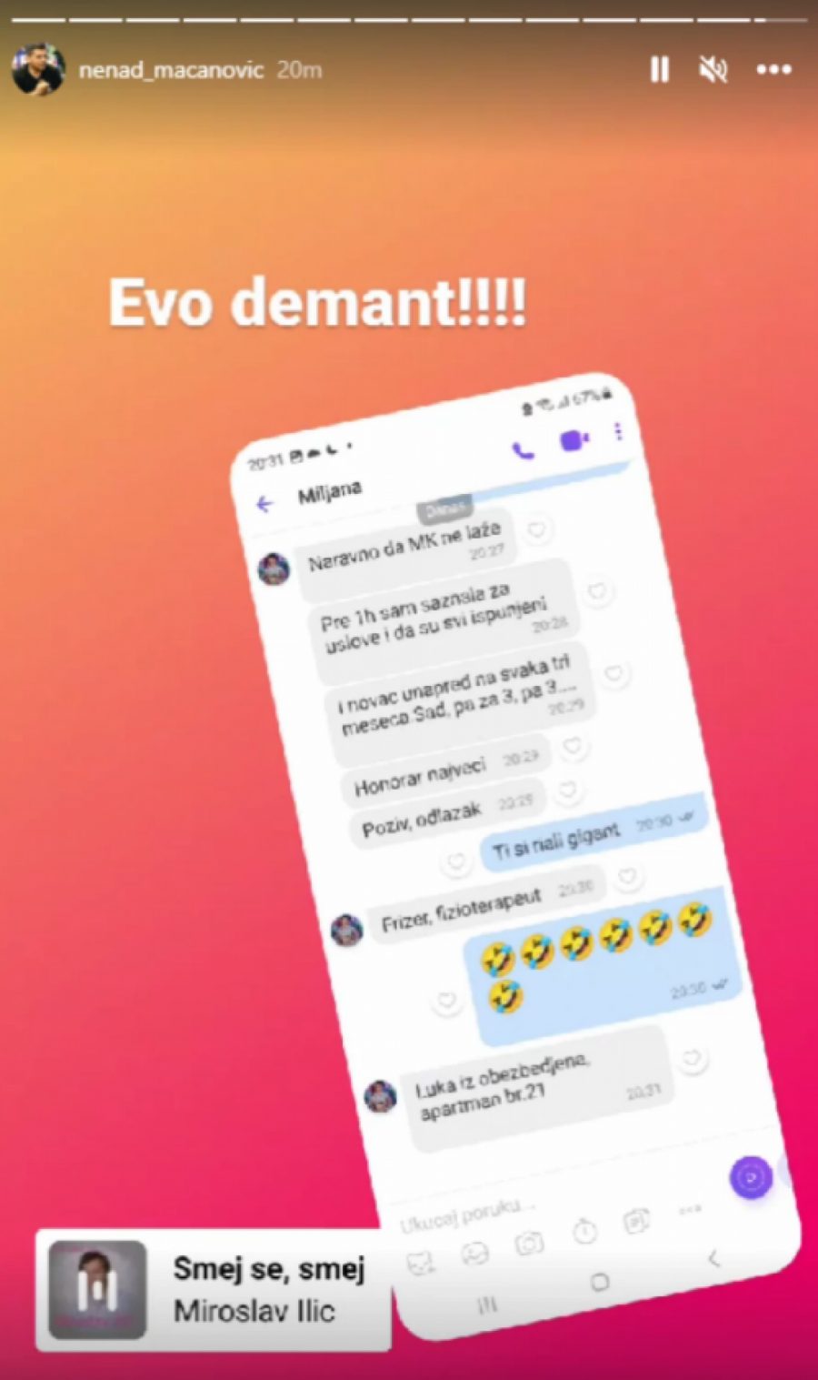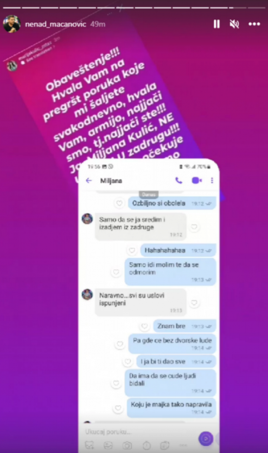 Međutim, njen bivši dečko, Nenad Macanović Bebica, odmah je demantovao Kulićevu, pa objavio njihove šokantne prepiske, u kojim Miljana objašnjava da ulazi u Zadrugu 7, jer su joj ispunjeni svi uslovi.