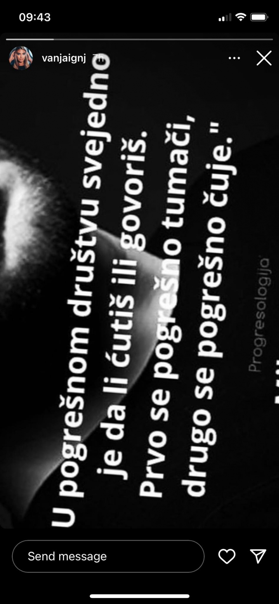 - U pogrešnom društvu svejedno je da li ćutiš ili govoriš, prvo se pogrešno protumači, drugo se pogrešno čuje - napisala je Vanja, a šta je imala da poruči reperu, verujemo da on zna, te da mu tek sada nije dobro.