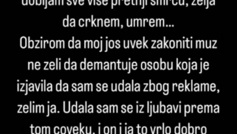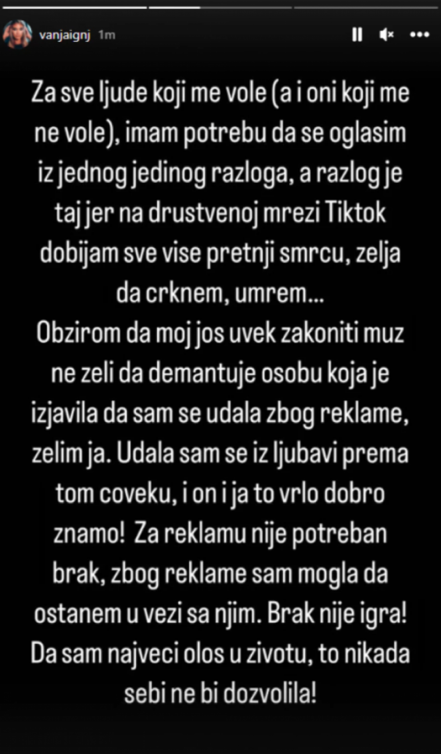 - Morala sam da se oglasim, zbog toga što na TikToku neprestano dobijam pretnje smrću. Moj muž ne želi da demantuje osobu, koja je rekla da sam se udala zbog reklame, tako da to moram učiniti ja. Nije bilo potrebe da se udam zbog reklame, udala sam se iz ljubavi prema tom čoveku i to znamo oboje - počela je Vanja, pa odmah nastavila: