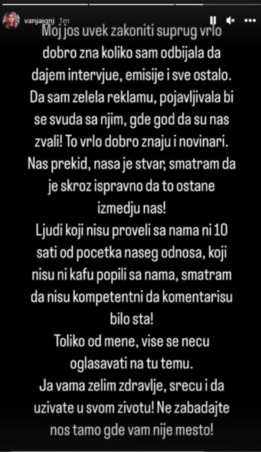 Međutim, kako to nije bilo dovoljno jasno, Vanja je sada odlučila da sve objasni putem Instagram storija, gde je isprozivala još uvek zakonitog supruga, ali i Jovanu Tomić Matoru, koja je nedavno izjavila da se Vanja udala zbog reklame:
