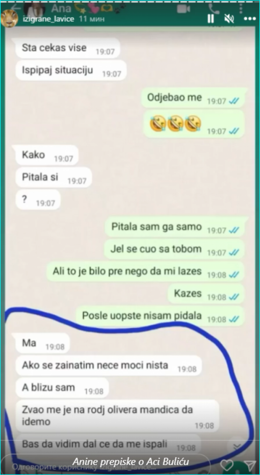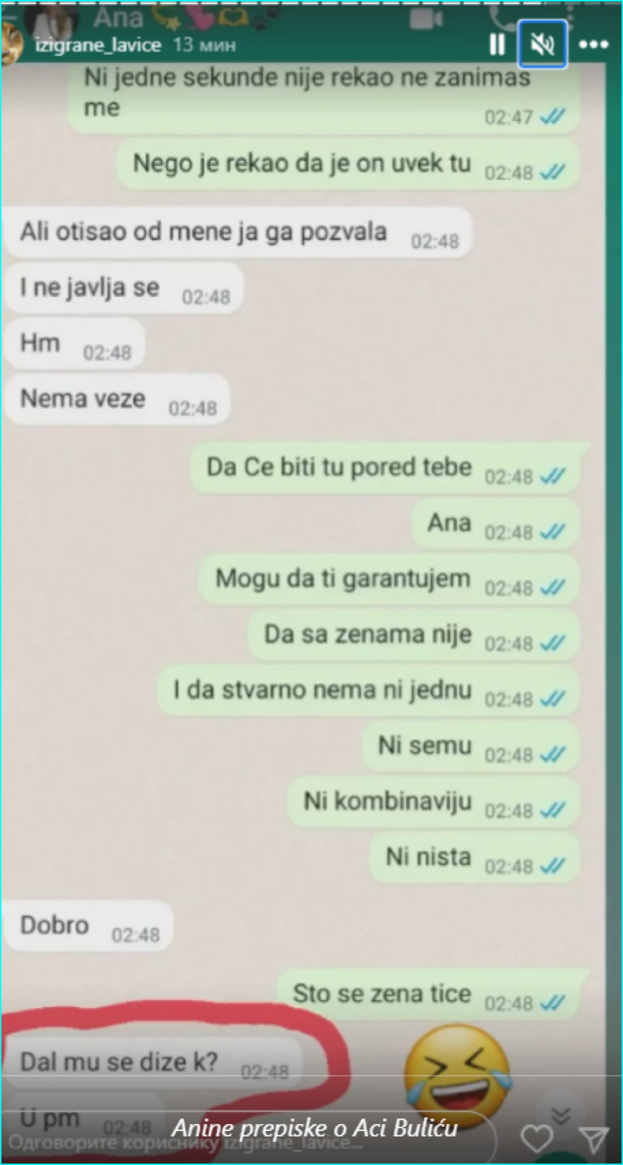 Grupa "Izigrane lavice", nekadašnja podrška Ane Ćurčić, nastavila je da raskrinkava drugoplasiranu takmičarku "Zadruge 6". Nakon prepiski gde se Ana raspituje o Zvezdanu Slavniću, procurile su i one gde otvoreno razgovara o Aci Buliću nakon njihovog raskida.