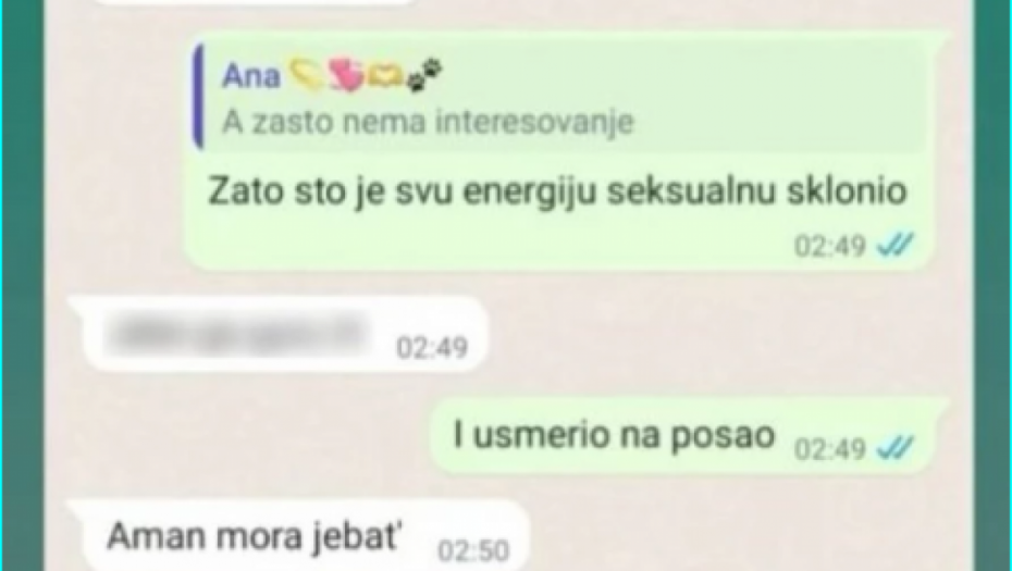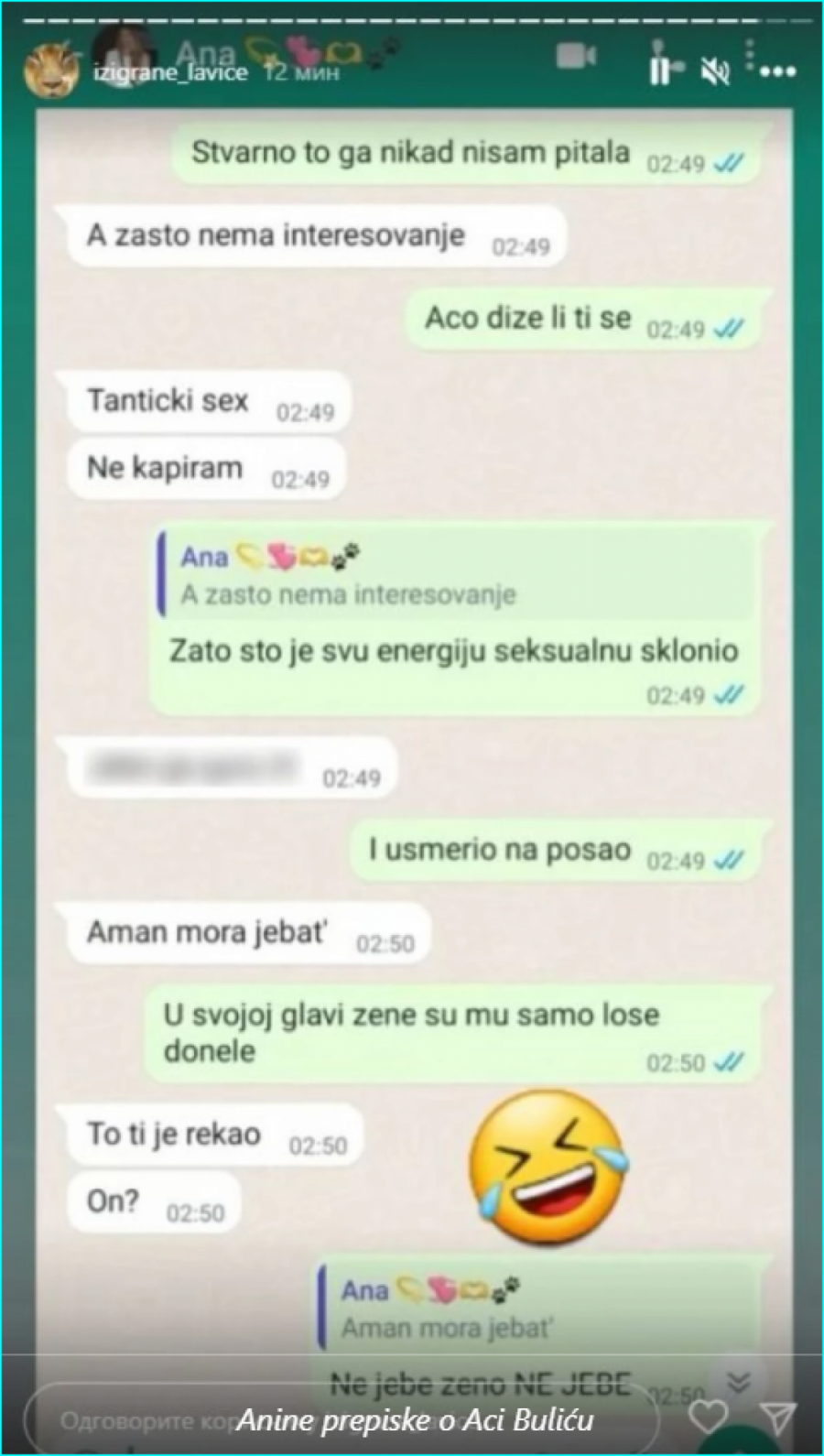 - Ma, ako se zainatim, neće moći ništa, a blizu sam. Zvao me je na rođendan Olivera Mandića da idemo, baš da vidim da li će da me ispali - napisala je Ana, koja je nastavila, te ponovo istakla da Aca ne može da ima s*ks.