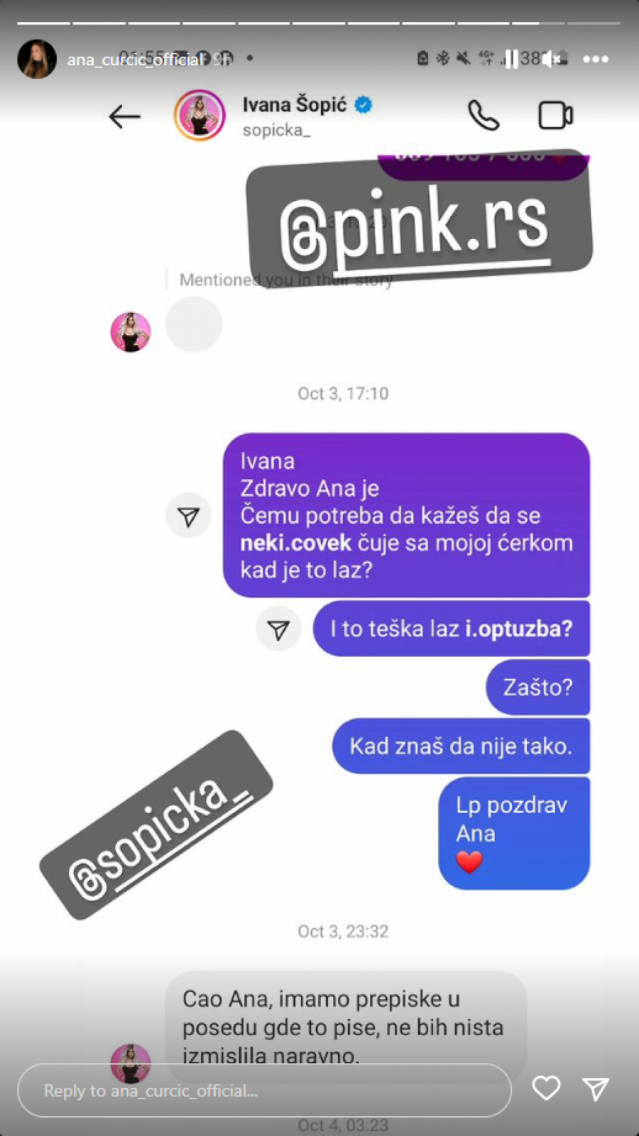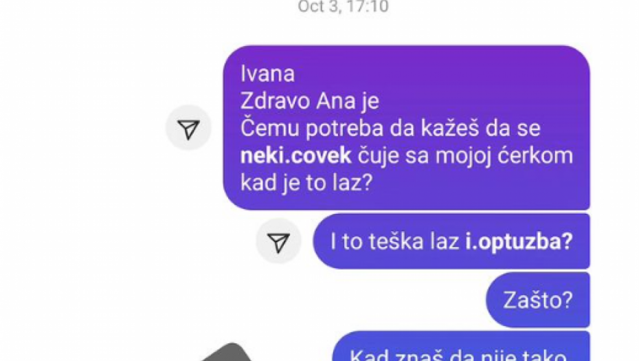 - Ivana zdravo, Ana je. Čemu potreba da kažeš da se neki čovek čuje sa mojom ćerkom kad je to laž? I to teška laž i optužba. Zašto? Kad znaš da nije tako. Lep pozdrav, Ana - napisala je Ćurčićeva, a Ivana joj je odgovorila.