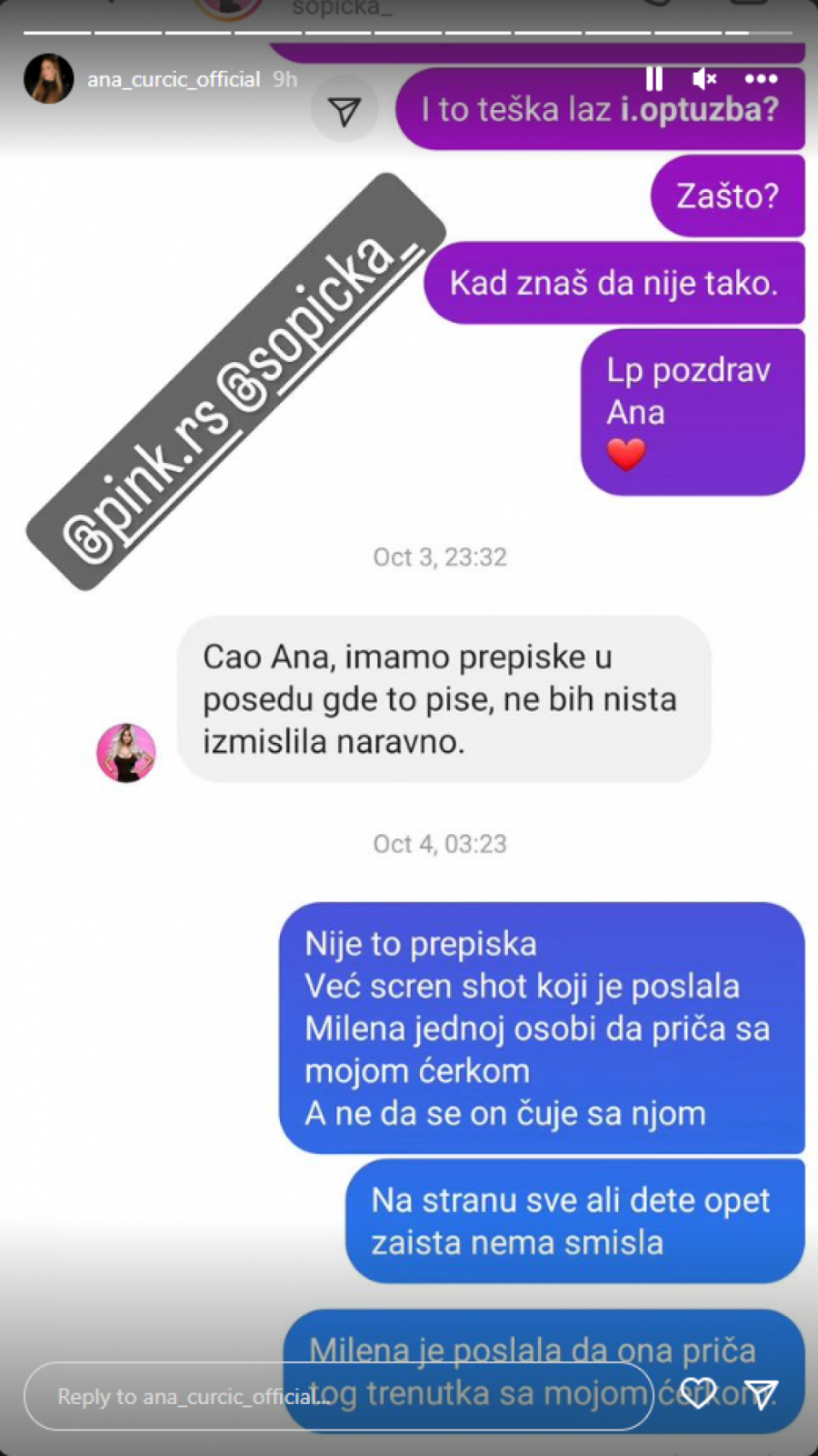 - Nije to prepiska, već skrinšot koji je poslala Milena jednoj osobi da priča sa mojom ćerkom. A ne da se on čuje sa njom. Na stranu sve, ali dete, opet zaista nema smisla. Milena je poslala da ona priča tog trenutka sa mojom ćerkom - odgovorila je Ana.