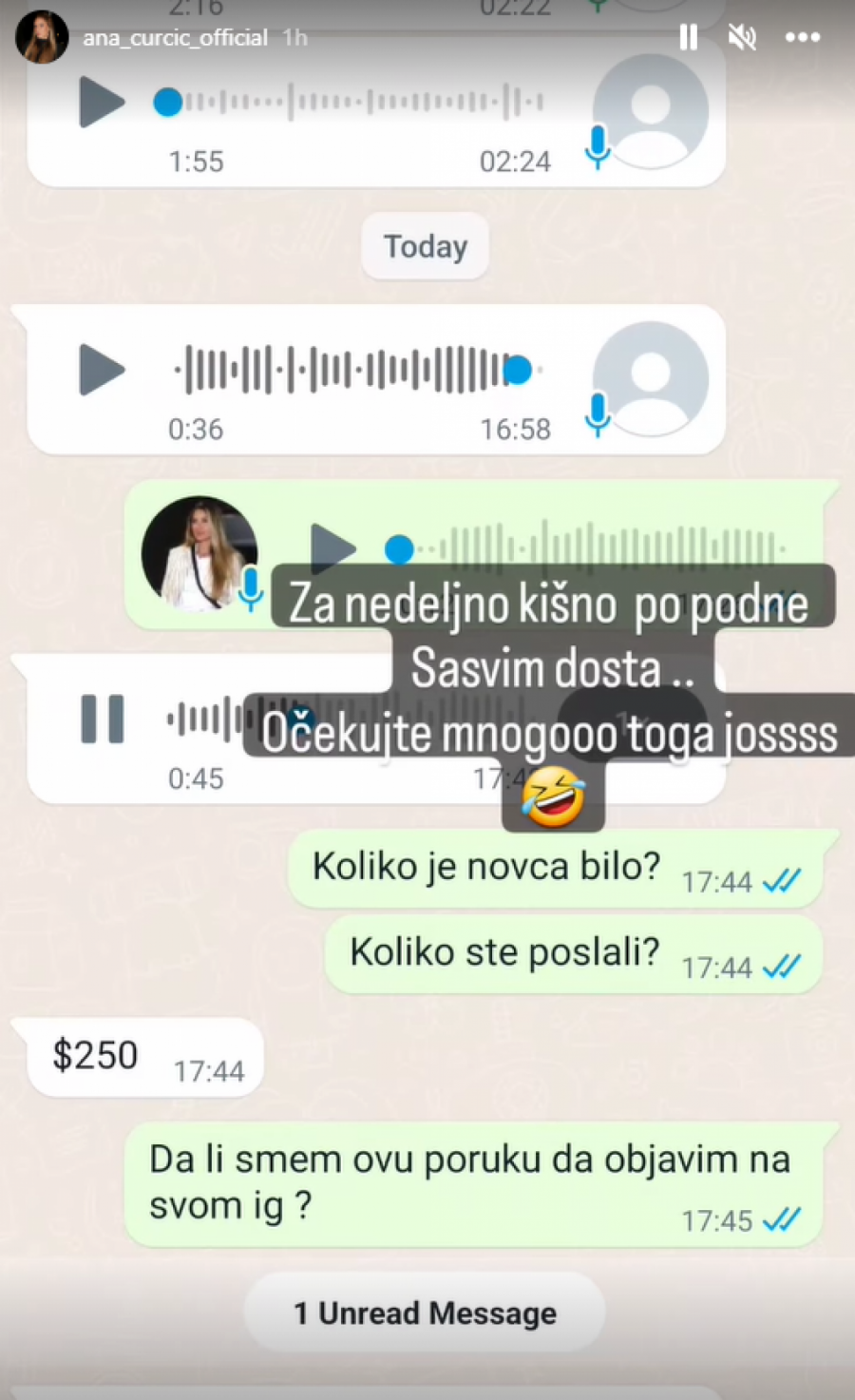 Ana je usnimila glasovnu poruku koju joj je Goga, članica njene podrške, usnimila. Kako je Goga navela, njenu izjavu Ana može da koristi na sudu protiv Milene i Marka.