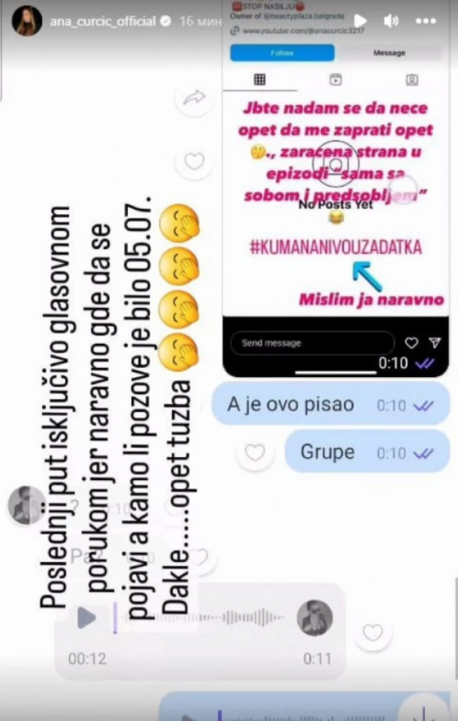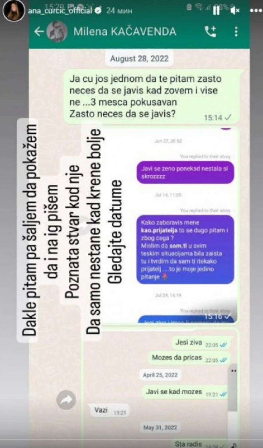 Bivša zadrugarka Ana Ćurčić i dalje vodi rat protiv svoje nekadašnje drugarice Milene Kačavenda. Danas je na društvenoj mreži Instagram objavila privatne prepiske sa Milenom, gde se vidi da ju je Kačavenda ignorisala i 2022. godine, iako joj se Ćurčićeva javila. Kako je Ana otkrila, ovo je trajalo tri meseca.