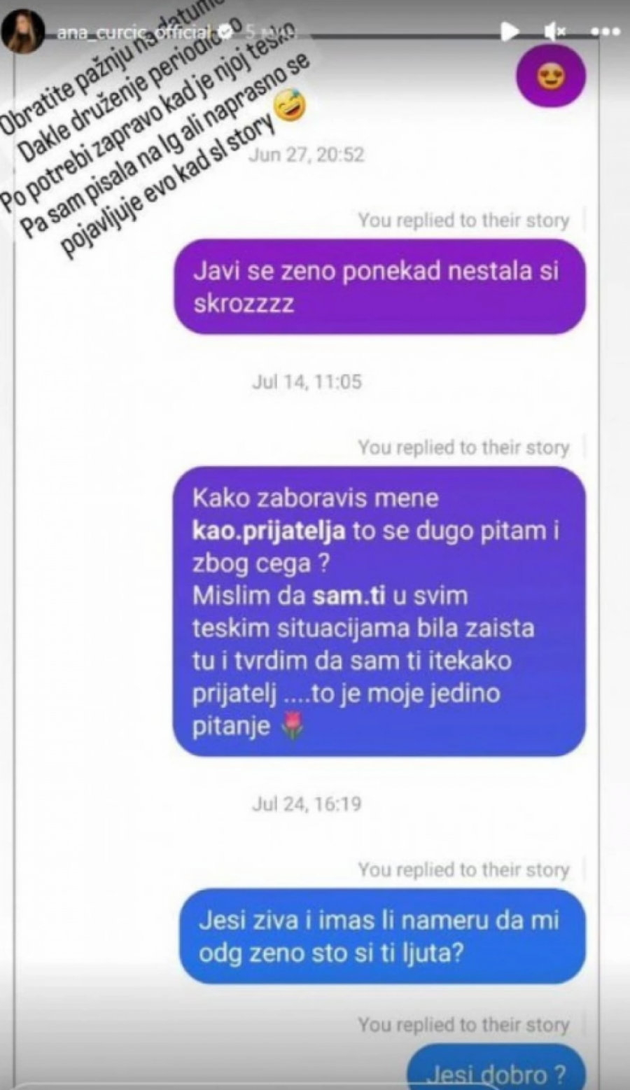 - Kako zaboraviš mene kao prijatelja, to se dugo pitam i zbog čega? Mislim da sam ti u svim teškim situacijama bila zaista tu i tvrdim da sam ti i te kako prijatelj. To je moje jedino pitanje - pisala je Ana 14. jula.