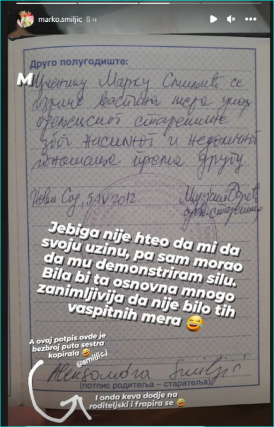 - Učeniku Marku Smiljuću se izriče vaspitna mera ukor odeljenskog starešine zbog nasilnog i nedoličnog ponašanja prema drugu - glasi ukor koji je dobio Marko.