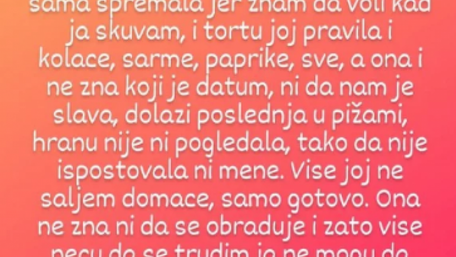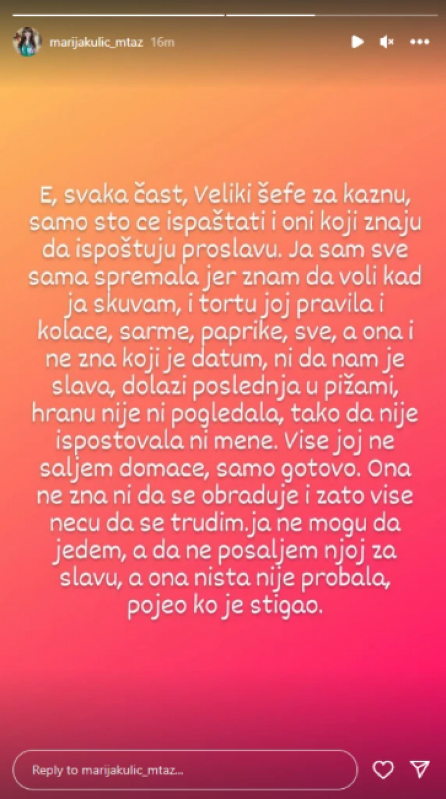 - E svaka čast, Velike šefe, za kaznu, samo što će ispaštati i oni koji znaju da ispoštuju proslavu. Ja sam sve sama spremala jer znam da voli kad ja skuvam, i tortu joj pravila i kolače, sarme, paprike, sve, a ona i ne zna koji je datum, ni da nam je slava. Dolazi poslednja u pidžami, hranu nije ni pogledala, tako da nije ispoštovala ni mene. Više joj ne šaljem domaće, samo gotovo. Ona ne zna ni da se obraduje i zato više neću da se trudim. Ja ne mogu da jedem, a da ne pošaljem njoj za slavu, a ona ništa nije probala, pojeo ko je stigao - napisala je Marija na svom profilu na društvenoj mreži Instagram.