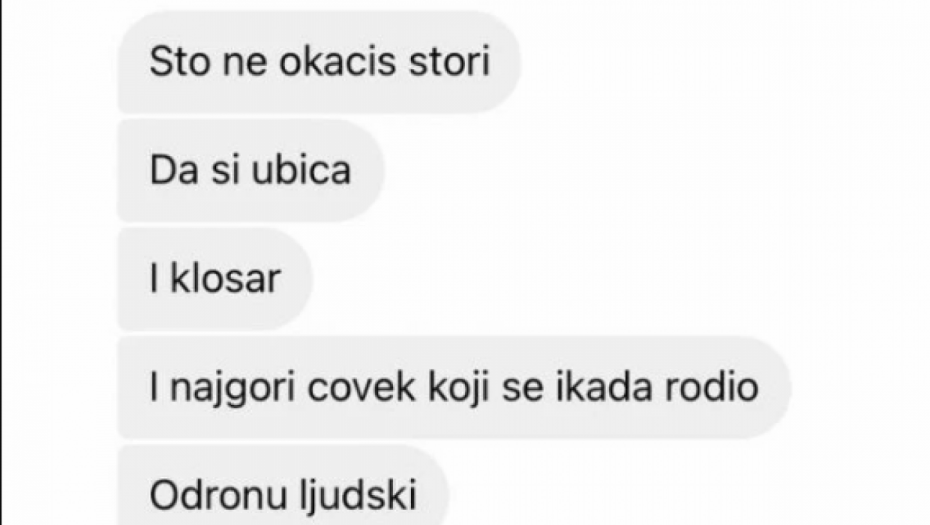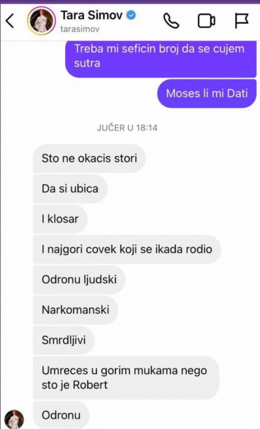 - Što ne okačiš stori da si ubica, klošar, najgori čovek koji se ikada rodio, umrećeš u gorim mukama nego Robert, odronu - napisala je Tara Mihiću.