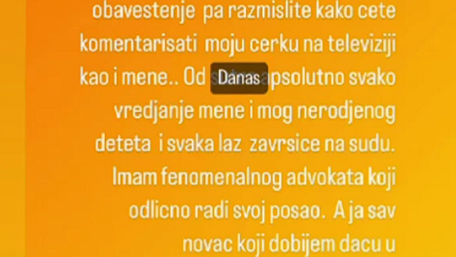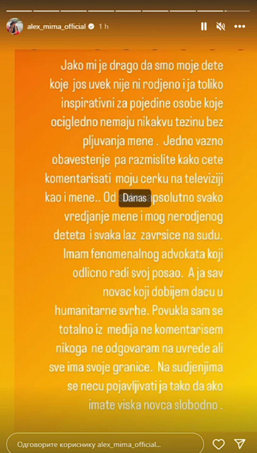 - Jako mi je drago da smomoje dete koje još uvek nije rođeno i ja toliko inspirativni za pojedine osobe koje očigledno nemaju nikakvu težinu bez pljuvanja mene. Jedno važno obaveštenje, pa razmislite kako ćete komentarisati moju ćerku na televiziji, kao i mene. Od danas apsolutno svako vređanje mene i mog nerođenog deteta i svaka laž završiće na sudu. Imam fenomenalnog advokata koji odlično radi svoj posao, a ja sav novac koji dobijem daću u humanitarne svrhe. Povukla sam se totalno iz medija, nekomentarišem nikoga, ne odgovaram na uvrede, ali sve ima granice. Na suđenjima se neću pojavljivati ja tako da ako imate viška novca, slobodno - poručila je besna Aleks putem svog Instagram profila.