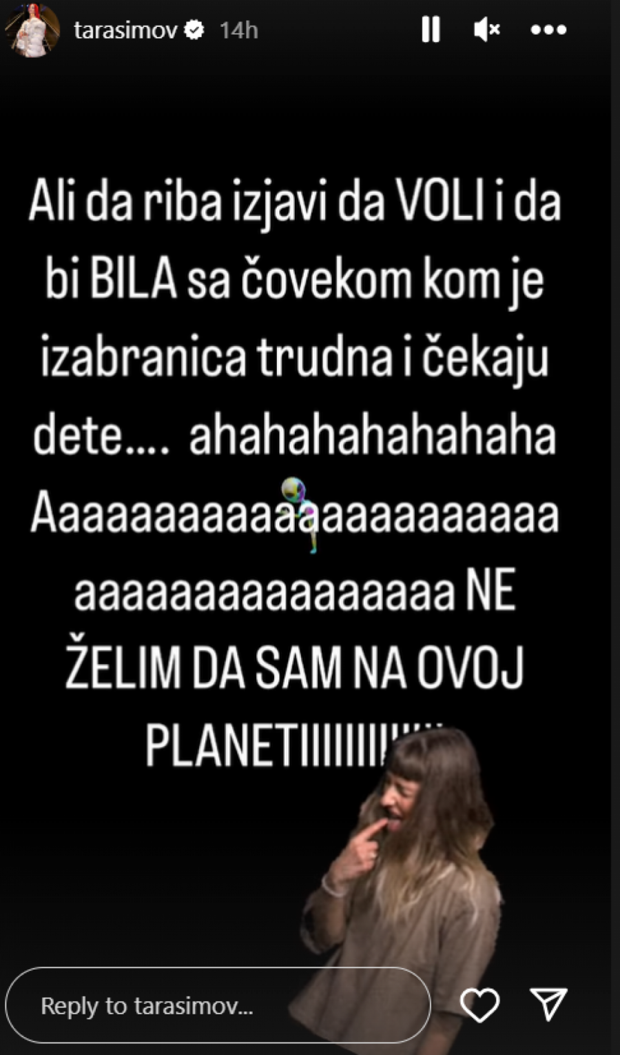 - Ali da riba izjavi da voli i da bi bila sa čovekom kom je izabranica trudna i čekaju dete... Ha-ha-ha-ha! Aaaaaaa! Ne želim da sam na ovoj planeti - napisaka je Tara Simov.