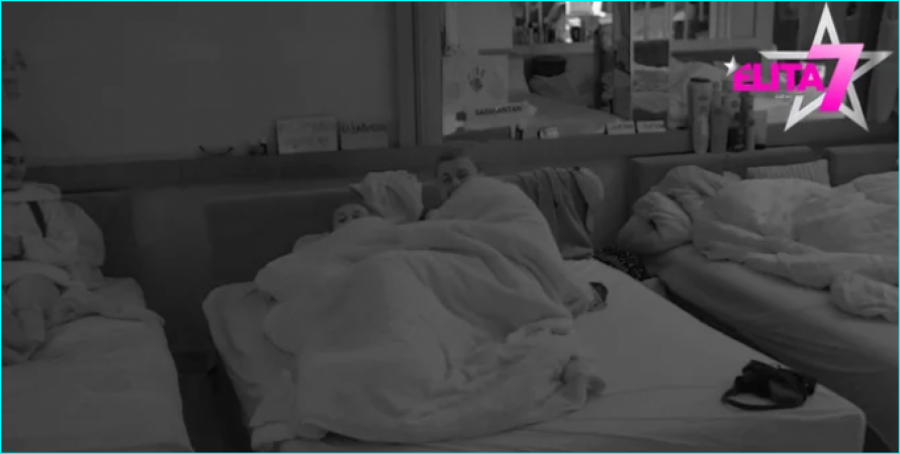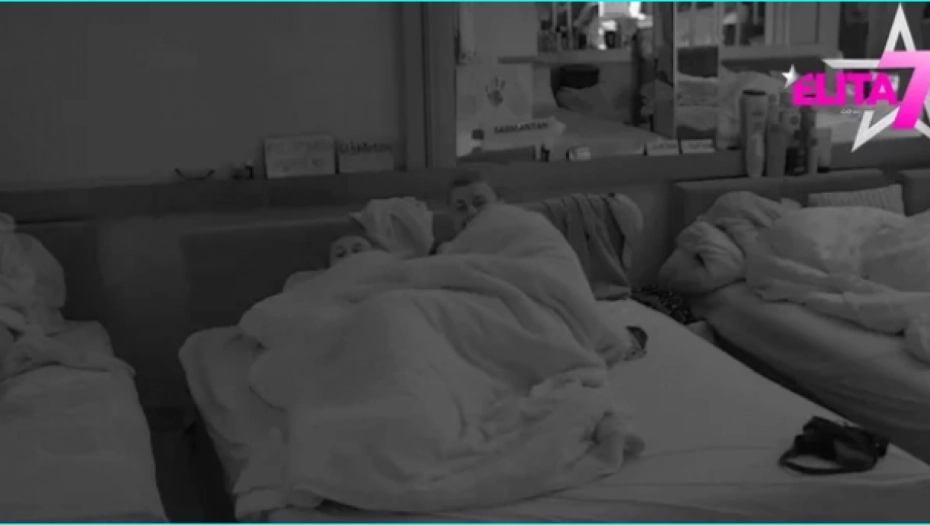 Učesnici Elite Milica Veličković i Borisav Terzić Terza se ne smiruju. Oni su sinoć pokriveni pod ćebetom razmenjivali nežnosti pred punom sobom.