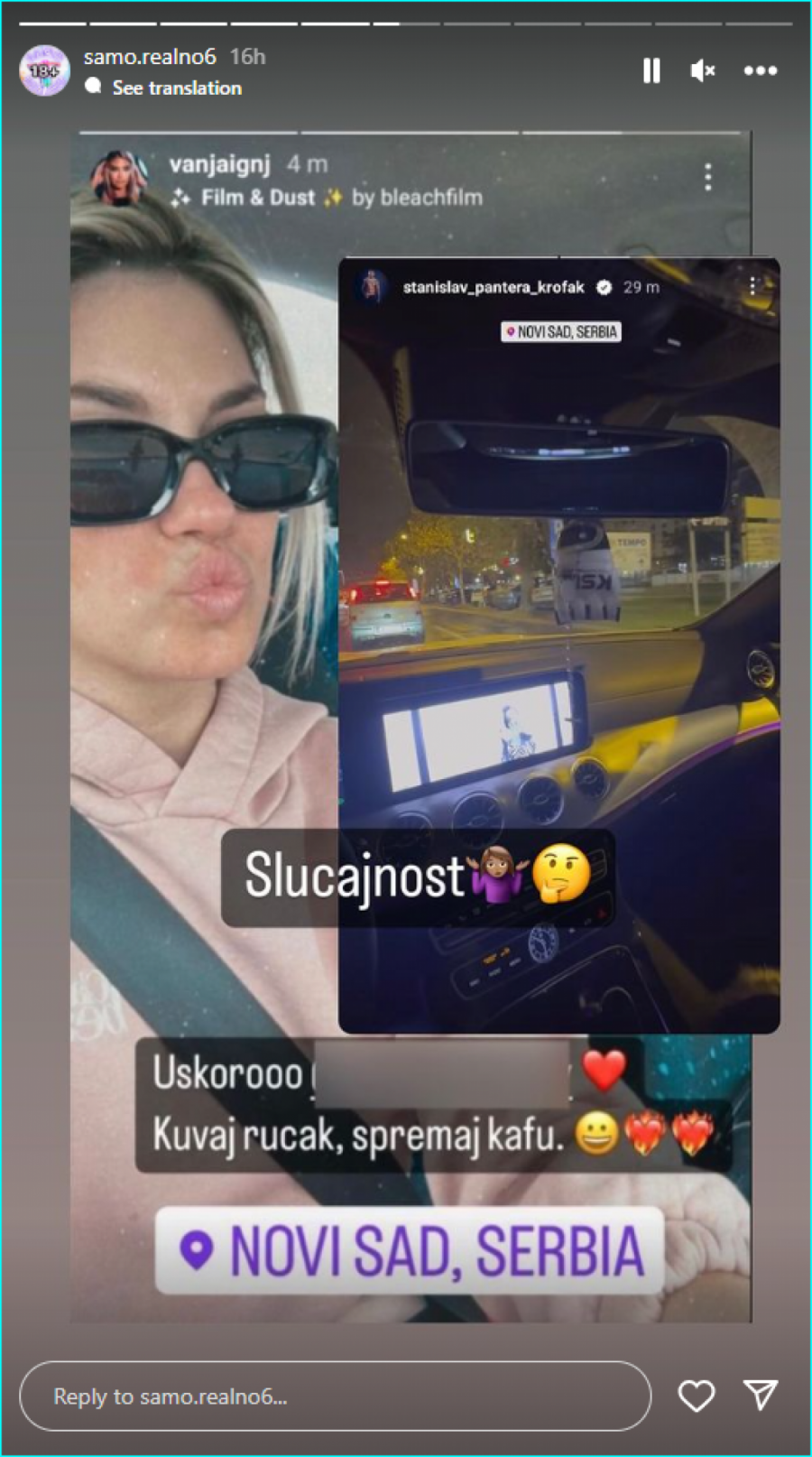 Naime, Vanja je juče otkrila da se nalazi u Novom Sadu, gde je uz snimak iz automobila poručila: