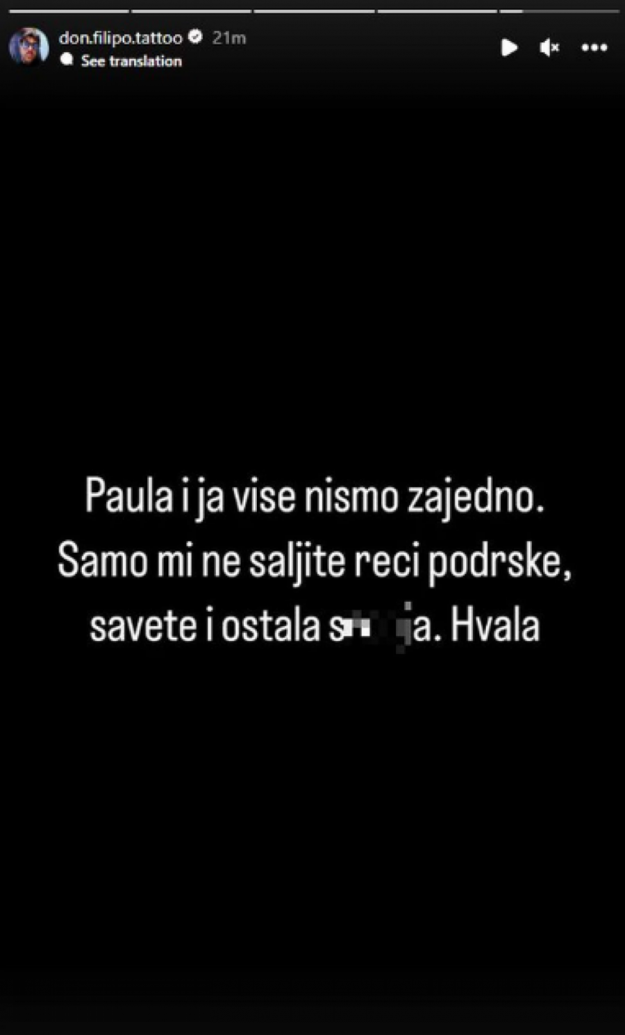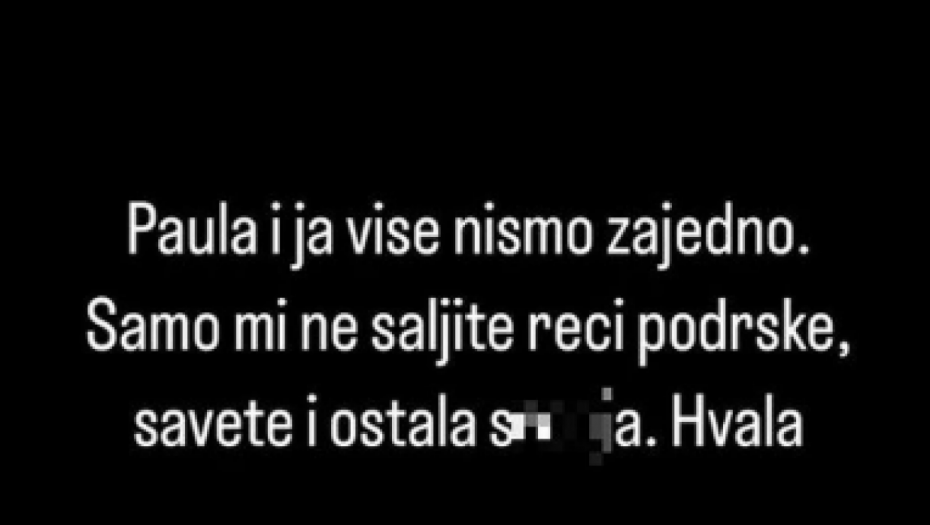 - Paula i ja više nismo zajedno. Samo mi ne šaljite reči podrške, savete i ostala s***a. Hvala - napisao je on na Instagramu.