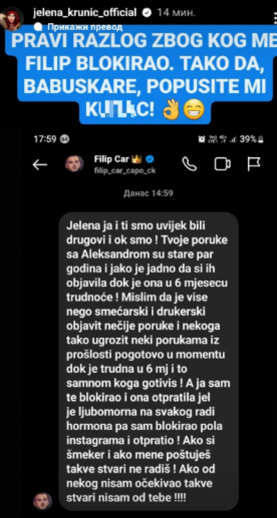 - Jelena, ti i ja smo uvek bili drugovi i okej smo. Tvoje poruke sa Aleksandrom su stare nekoliko godina i jako je jadno što si ih objavila dok je ona u šestom mesecu trudnoće. Mislim da je više nego smećarski i drukerski objaviti nečije poruke i nekoga tako ugroziti porukama iz prošlosti, pogotovo dok je trudna, u šestom mesecu trudnoće, i to sa mnom, koga gotiviš. A ja sam te blokirao i ona otpratila jer je ljubomorna na svakog zbog hormona, pa sam blokirao pola Instagrama i otpratio. Ako si šmeker i ako mene poštuješ takve stvari ne radiš. Ako od nekoga nisam očekivao takve stvari nisam od tebe - glasi poruka za koju Krunićeva tvrdi da joj je poslao Car