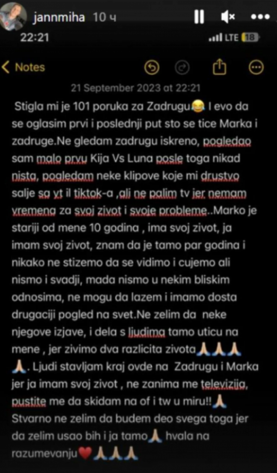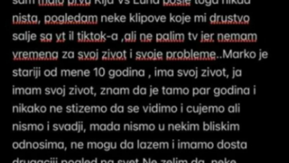 - Stigla mi je 101 poruka vezano za mog brata Marka i njegovo učešće u rijaliti-programima. Evo da se oglasim prvi i poslednji put što se toga tiče. Ne gledam mnogo televiziju, iskreno, pogledao sam malo prvu sezonu "Zadruge" i to je sve. Posle toga nikad ništa, pogledam neke klipove koje mi društvo šalje sa Jutjuba i Tik-toka, ali ne palim TV jer nemam vremena za svoj život i svoje probleme. Marko je stariji od mene 10 godina, ima svoj život, ja imam svoj. Znam da je tamo nekoliko godina i nikako ne stižemo da se vidimo i čujemo, ali nismo u svađi, mada nismo u nekim bliskim odnosima. Ne mogu da lažem, imamo i dosta drugačiji pogled na svet. Ne želim da neke njegove izjave i dela s ljudima tamo utiču na mene jer živimo dva različita života - napisao je tada Janjušev brat, pa dodao: