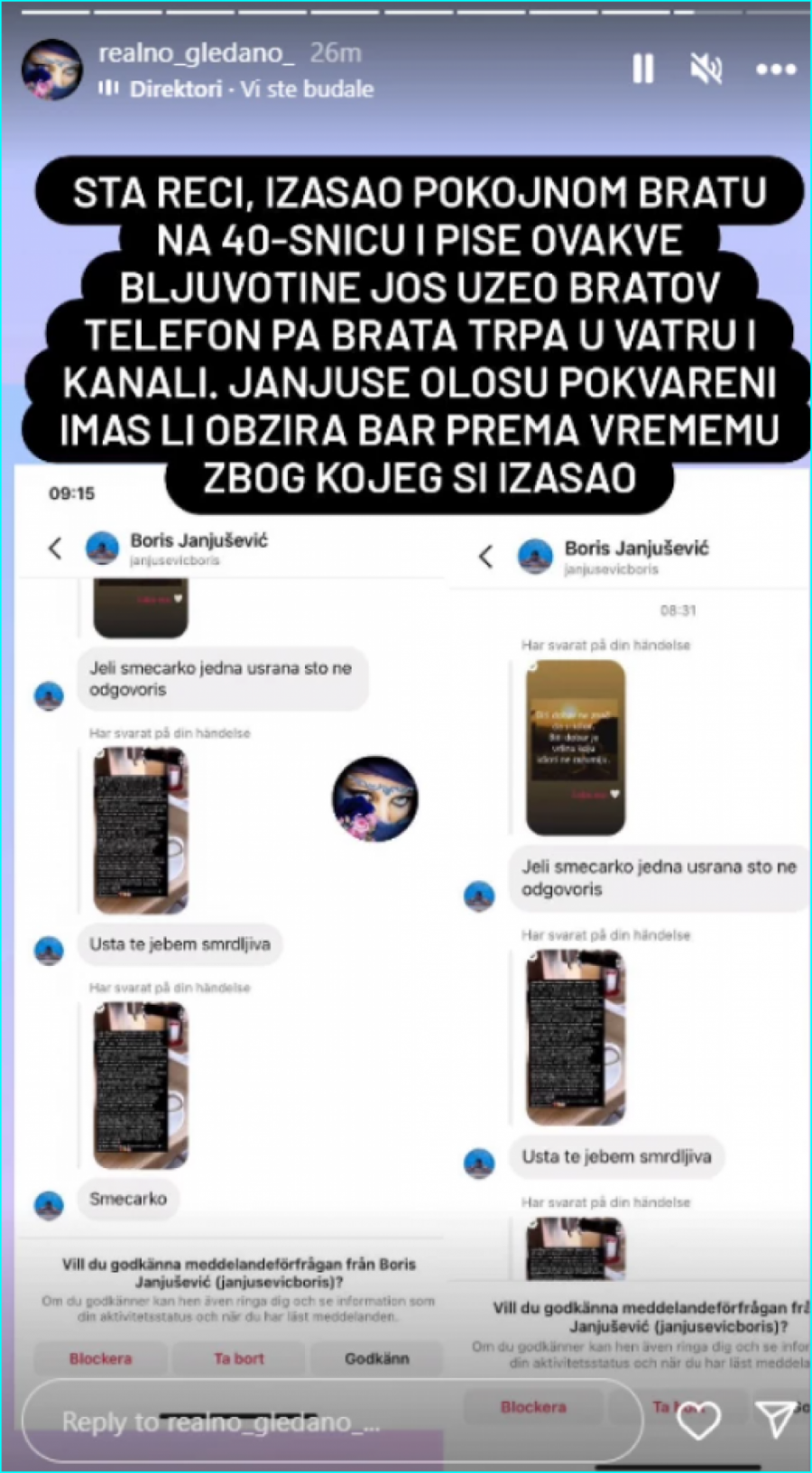 Naime, Jelena je dobila poruke koje su joj stigle sa profila Janjuševog srednjeg brata, Borisa Janjuševića, a mnogi su sigurni da ih je napisao Janjuš, zbog njegovog načina izražavanja koji je već poznat.