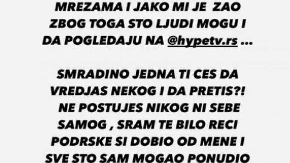 - Već u ponedeljak idem da podnesem krivične prijave, a prijavio sam pretnje u MUP. Sm*adino jedna, ti ćeš nekom da pretiš! Mislio sam da si ljudina, bio uz tebe kad ti je bilo najteže, a ti mi pretiš. Nisam ti ta tvoja žena da možeš tako sa mnom. Posle ovih reči koje si mi javno uputio, za to ćeš odgovarati u to ti se kunem - napisao je između ostalog Bane koji je dodao i da je izjavio saučešće Janjušu čim se dogodila tragedija.