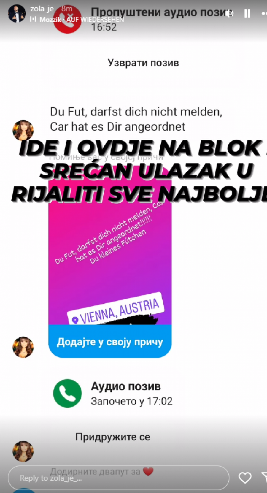 - Lokacija eror - napisao je Čolić i u sledećem storiju poželeo Miljani sretan ulazak u rijaliti: