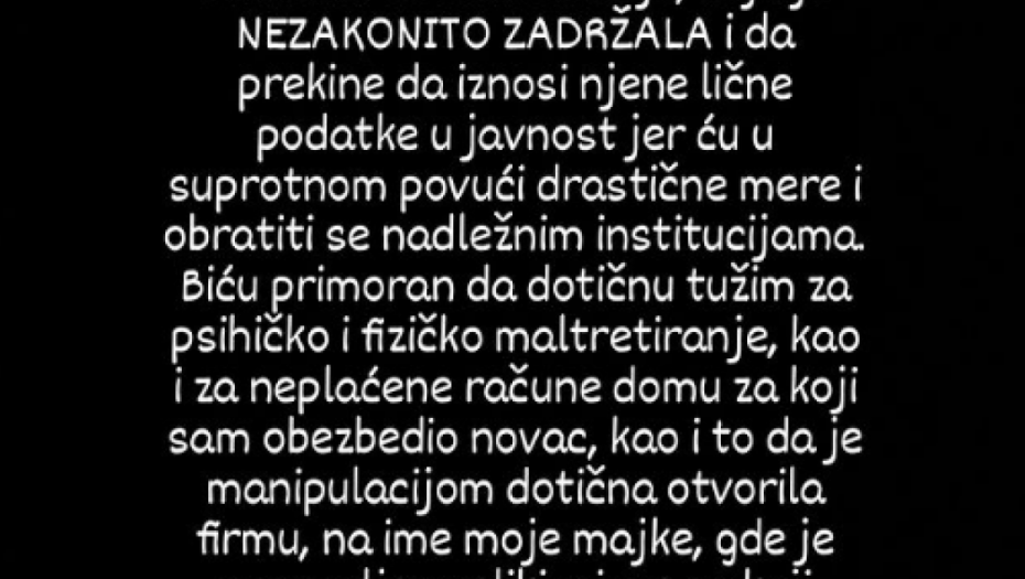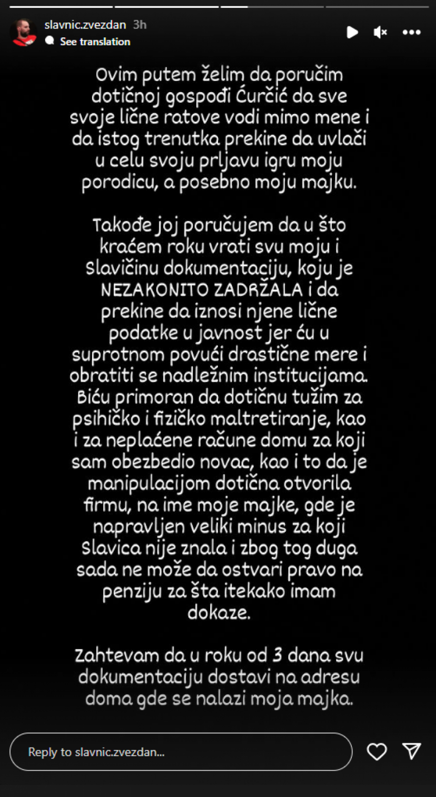 - Takođe joj poručujem da u što kraćem roku vrati svu moju i Slavičinu dokumentaciju, koju je NEZAKONITO ZADRŽALA i da prekine da iznosi njene lične podatke u javnost, jer ću u suprotnom povući drastične mere i obratiti se nadležnim institucijama. Biću primoran da dotičnu tužim za psihičko i fizičko maltretiranje, kao i za neplaćene račune domu za koji sam obezbedio novac, kao i to da je manipulacijom dotična otvorila firmu, na ime moje majke, gde je napravljen veliki minus za koji Slavica nije znala i zbog tog duga sada ne može da ostvari pravo na penziju, za šta i te kako imam dokaze.Zahtevam da u roku od 3 dana svu dokumentaciju dostavi na adresu doma gde se nalazi moja majka - napisao je Slavnić.