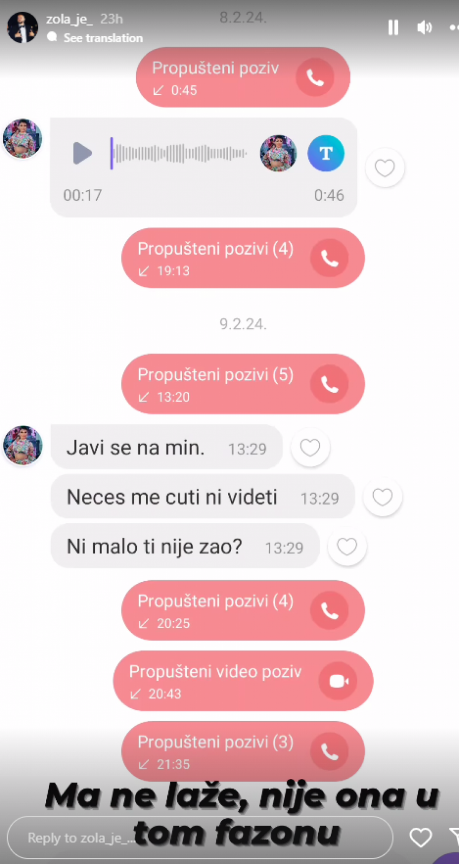 - Ma ne laže, nije ona u tom fazonu - napisao je Zola, a nakon toga objavio prepisku sa Miljanom gde se jasno vidi da ništa od navedenog što je Miljana rekla nije istina.