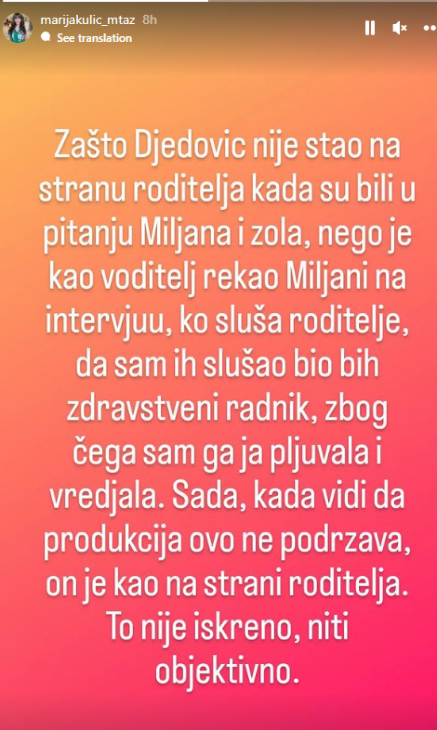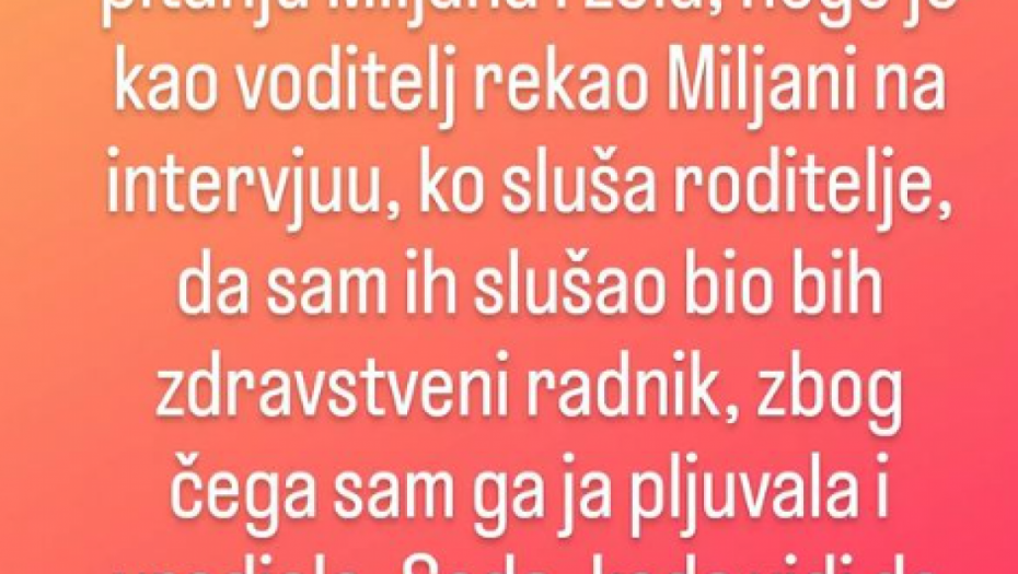 - Zašto Đedović nije stao na stranu roditelja kada su bili u pitanju Miljana i Zola, nego je rekao Miljani: "Ko sluša roditelje, da sam ih slušao bio bih zdravstveni radnik!", zbog čega sam ga ja pljuvala i vređala, a sada kao on je na strani roditelja. To nije iskreno - poručila je Marija putem društvene mreže.