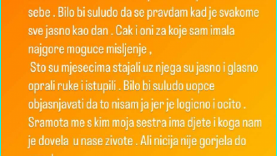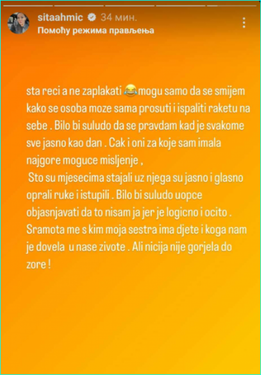 - Šta reći, a ne zaplakati? Mogu samo da se smejem kako se osoba može sama prosuti i ispaliti raketu na sebe. Bilo bi suludo da se pravdam kada je svima sve jasno kao dan. Čak i oni za koje sam mesecima imala najgore moguće mišljenje, oni koji su mesecima stajali uz njega su jasno i glasno oprali ruke i istupili. Bilo bi suludo uopšte objašnjavati da to nisam ja, jer je suludo i očito. Sramota me je sa kim moja sestra ima dete i koga nam je dovela u naše živote, ali ničija nije gore do zore - napisala je Sita u svojoj Instagram objavi.