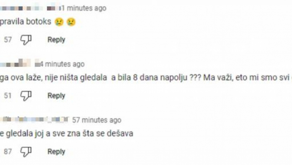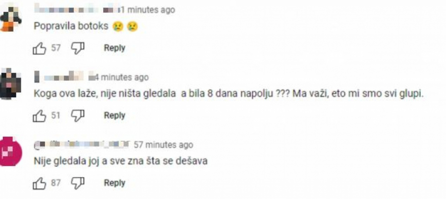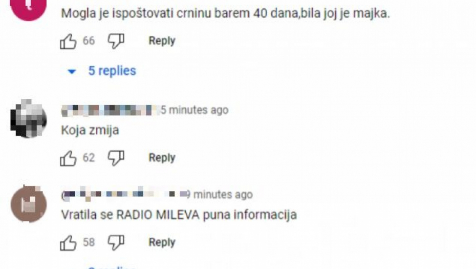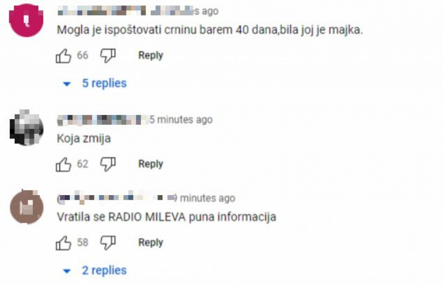 "Da li je ova radila usta? SAD!!! O, moj Bože", "Popravila botoks", Koga ova laže, nije ništa gledala, a bila osam dana napolju? Ma važi, eto mi smo svi glupi", "Nije gledala joj, a sve zna šta se dešava", "Mogla je da ispoštuje crninu barem 40 dana, bila joj je majka", "Koja zmija", "Vratila se radio Mileva puna informacija", "BItno da je pumpala usta, Bože sačuvaj" "Sahranila majku, pa napumpala usne", samo su neki od komentara ispod raznih objava.