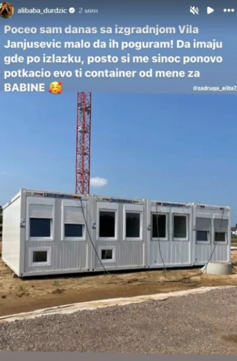 - Počeo sam danas sa izgradnjom "Vila Janjušević" malo da ih poguram, da imaju gde po izlasku, pošto si me sinoć ponovo potkačio, evo ti kontejner od mene za babine - napisao je Asmin.