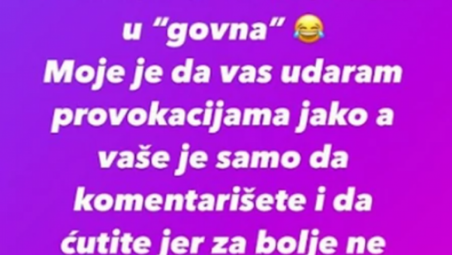 - Moram da rešim situaciju. Dakle, da se ja brinem ko će šta da kaže, ne bih ni uskočila u go**a. Moje je da vas udaram provokacijama jako, a vaše je samo da komentarišete i da ćutite jer za bolje ne znate. Malo više gledajte svoja posla, pustite vi mene. Laku noć - poručila je.