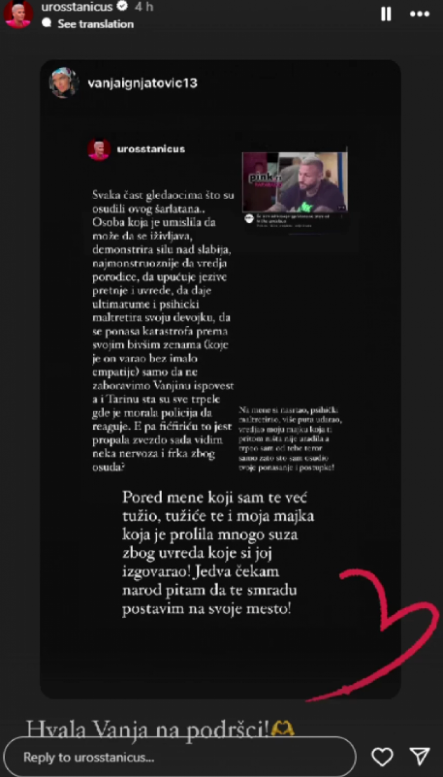 - Hvala Vanja na podršci - napisao je Uroš i podelio javno sve.