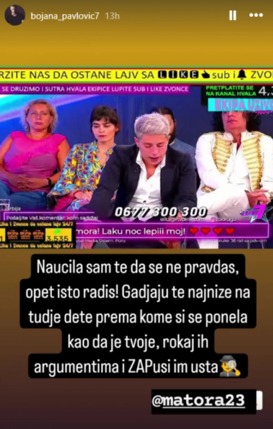 - Naučila sam te da se ne pravdaš, opet išto radiš! Gađaju te najniže na tuđe dete, prema kome si se ponela kao da je tvoje. Rokaj ih argumentima i zapuši im usta - poručila je Bojana Pavlović.