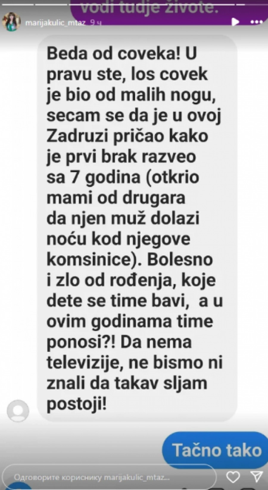 - Beda od čoveka. U pravu ste, loš čovek je bio od malih nogu, sećam se da je u ovoj "Zadruzi" pričao kako je prvi brak razveo sa sedam godina (otkrio mami od drugara da njen muž dolazi noću kod njegove komšinice). Bolesno i zlo od rođenja, koje dete se time bavi, a u ovim godinama time ponosi?! Da nema televizije, ne bismo ni znali da takav šljam postoji! - nastavili su njihovi pratioci.